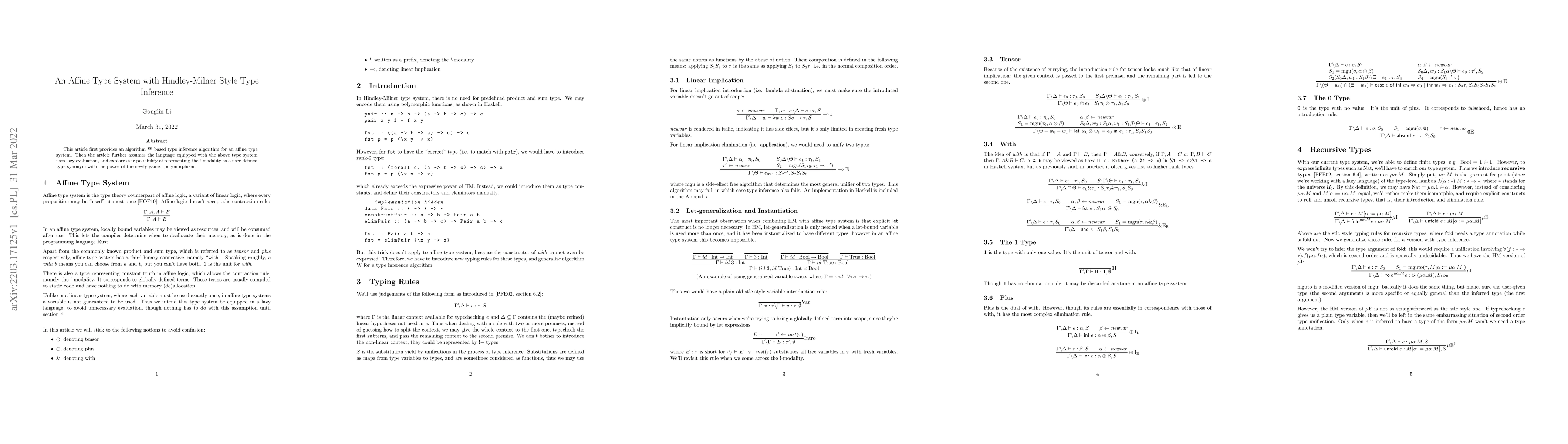This article first provides an algorithm W based type inference algorithm for an affine type system. Then the article further assumes the language equipped with the above type system uses lazy evaluation, and explores the possibility of representing the !-modality as a user-defined type synonym with the power of the newly gained polymorphism.