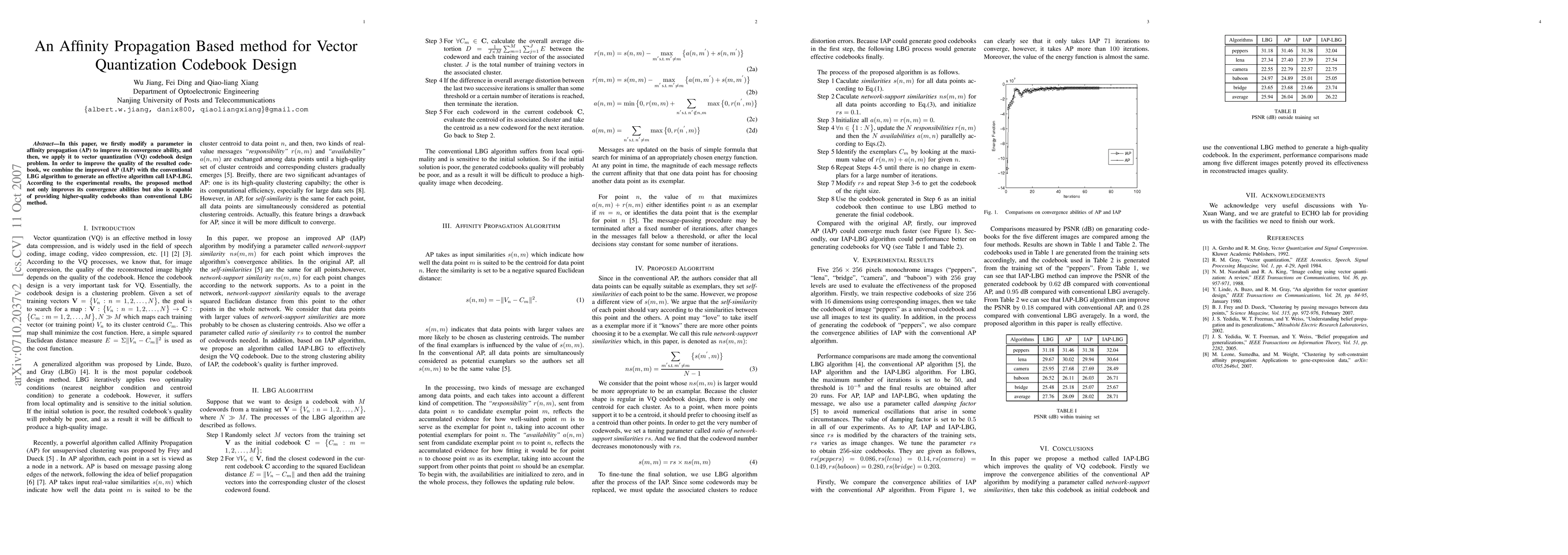 In this paper, we firstly modify a parameter in affinity propagation (AP) to improve its convergence ability, and then, we apply it to vector quantization (VQ) codebook design problem. In order to improve the quality of the resulted codebook, we combine the improved AP (IAP) with the conventional LBG algorithm to generate an effective algorithm call IAP-LBG. According to the experimental results, the proposed method not only enhances the convergence abilities but also is capable of providing higher-quality codebooks than conventional LBG method.