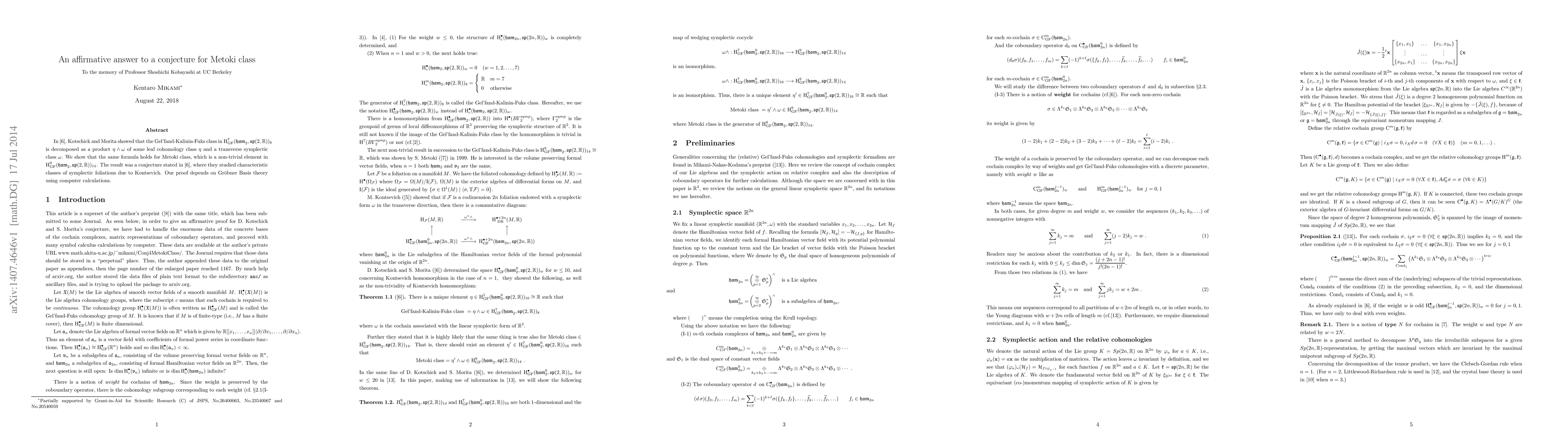 Title: An affirmative answer to a conjecture for Metoki class Summary: The paper confirms a conjecture by Kotschick and Morita regarding the decomposition of the Metoki class as a product of a leaf cohomology class and a transverse symplectic class, proving it using Groebner Basis theory and computer calculations.