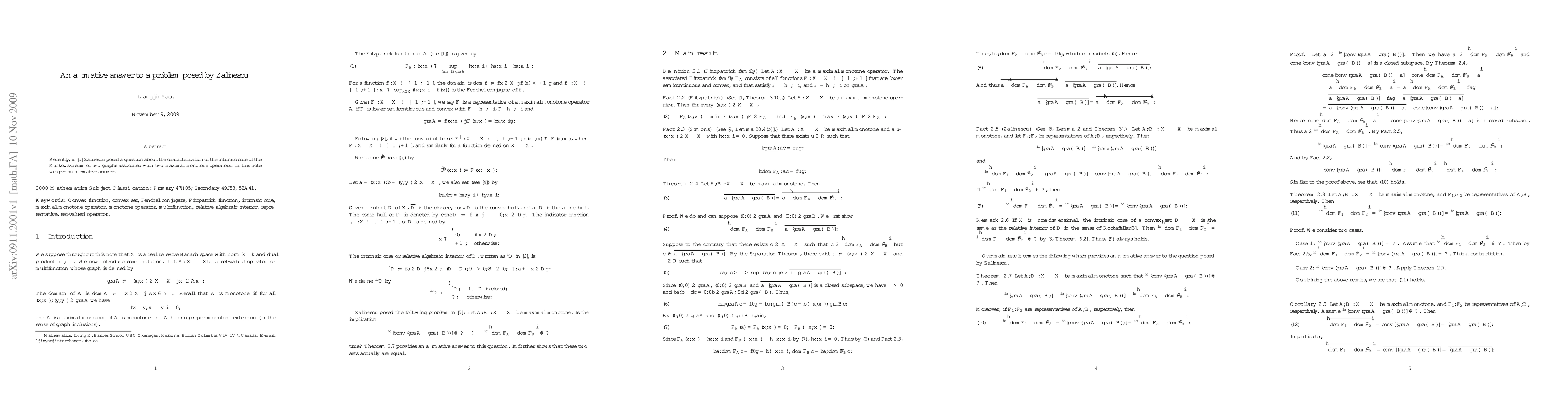 Summary: This paper provides a solution to a question posed by Zalinescu regarding the characterization of the intrinsic core of the Minkowski sum of two graphs linked to maximal monotone operators. The study affirms the proposed problem's hypothesis.