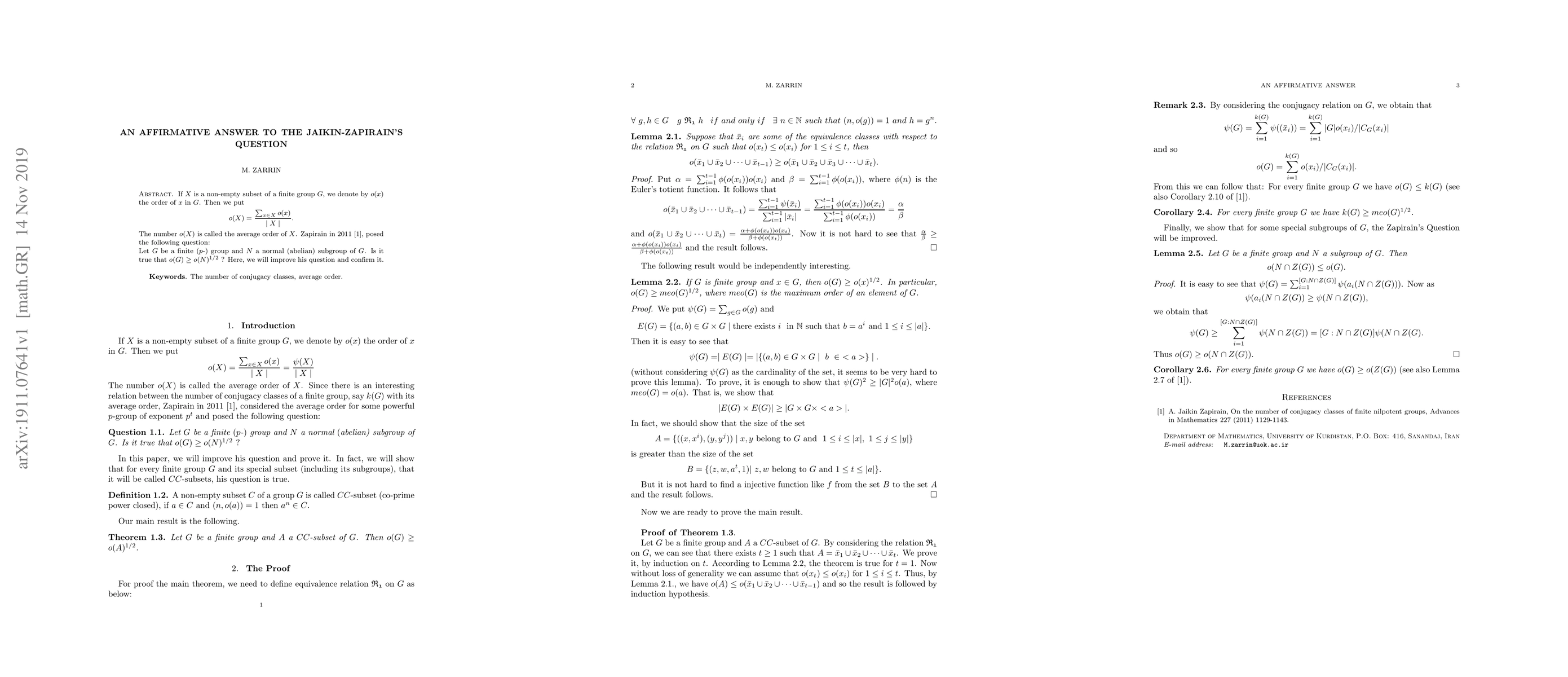 If X is a non-empty subset of a finite group G, we denote by o(x) the order of x in G. Then we put The number o(X) is called the average order of X. Zapirain in 2011 , posed the following question: Let G be a finite (p-) group and N a normal (abelian) subgroup of G. Is it true that o(G) ? Here, we will improve his question and confirm it.