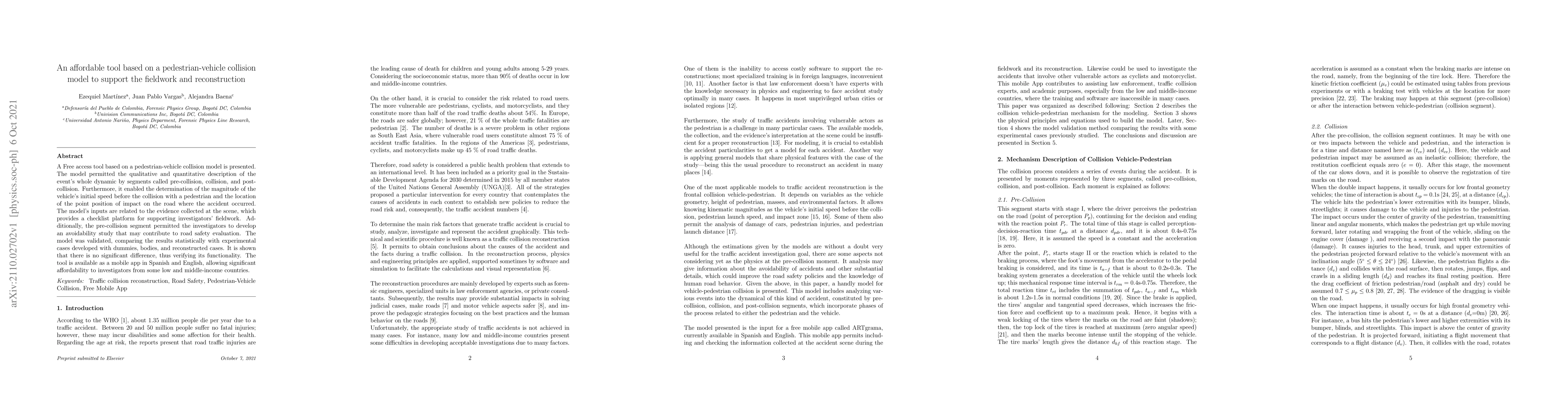 A Free access tool based on a pedestrian-vehicle collision model is presented. The model permitted the qualitative and quantitative description of the events whole dynamic by segments called pre-collision, collision, and post collision. Furthermore, it enabled the determination of the magnitude of the vehicles initial speed before the collision with a pedestrian and the location of the point position of impact on the road where the accident occurred. The models inputs are related to the evidence collected at the scene, which provides a checklist platform for supporting investigators fieldwork. Additionally, the pre-collision segment permitted the investigators to develop an avoidability study that may contribute to road safety evaluation. The model was validated, comparing the results statistically with experimental cases developed with dummies, bodies, and reconstructed cases. It is shown that there is no significant difference, thus verifying its functionality. The tool is available as a mobile app in Spanish and English, allowing significant affordability to investigators from some low and middle-income countries.