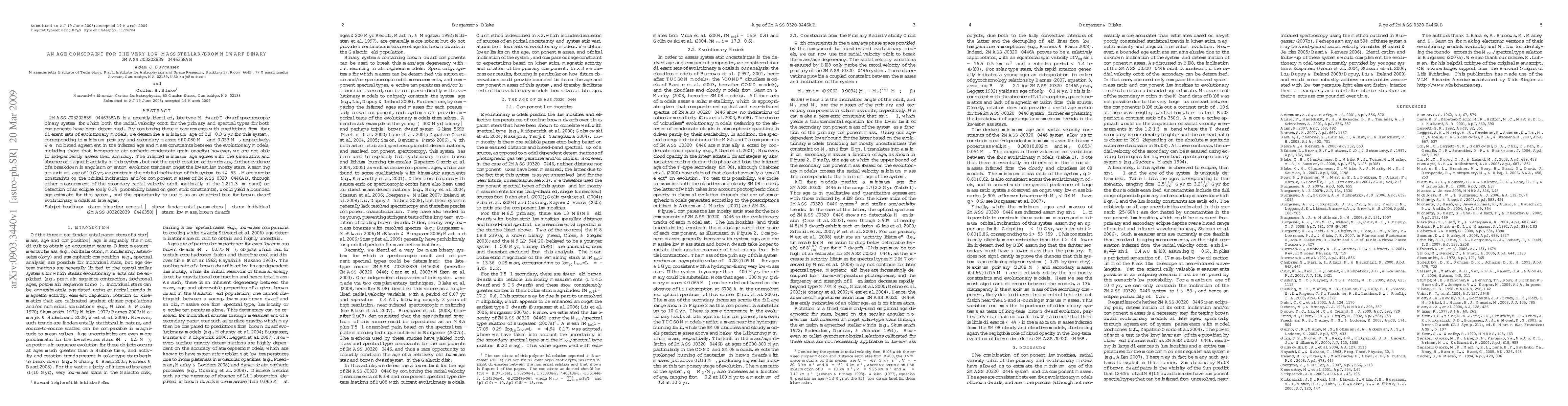 2MASS J03202839-0446358AB is a recently identified, late-type M dwarf/T dwarf spectroscopic binary system for which both the radial velocity orbit for the primary and spectral types for both components have been determined. By combining these measurements with predictions from four different sets of evolutionary models, we determine a minimum age of 2.0+/-0.3 Gyr for this system, corresponding to minimum primary and secondary masses of 0.080 Msun and 0.053 Msun, respectively. We find broad agreement in the inferred age and mass constraints between the evolutionary models, including those that incorporate atmospheric condensate grain opacity; however, we are not able to independently assess their accuracy. The inferred minimum age agrees with the kinematics and absence of magnetic activity in this system, but not the rapid rotation of its primary, further evidence of a breakdown in angular momentum evolution trends amongst the lowest luminosity stars. Assuming a maximum age of 10 Gyr, we constrain the orbital inclination of this system to i >~ 53 degrees. More precise constraints on the orbital inclination and/or component masses of 2MASS J0320-0446AB, through either measurement of the secondary radial velocity orbit (optimally in the 1.2-1.3 micron band) or detection of an eclipse (only 0.3% probability based on geometric constraints), would yield a bounded age estimate for this system, and the opportunity to use it as an empirical test for brown dwarf evolutionary models at late ages.