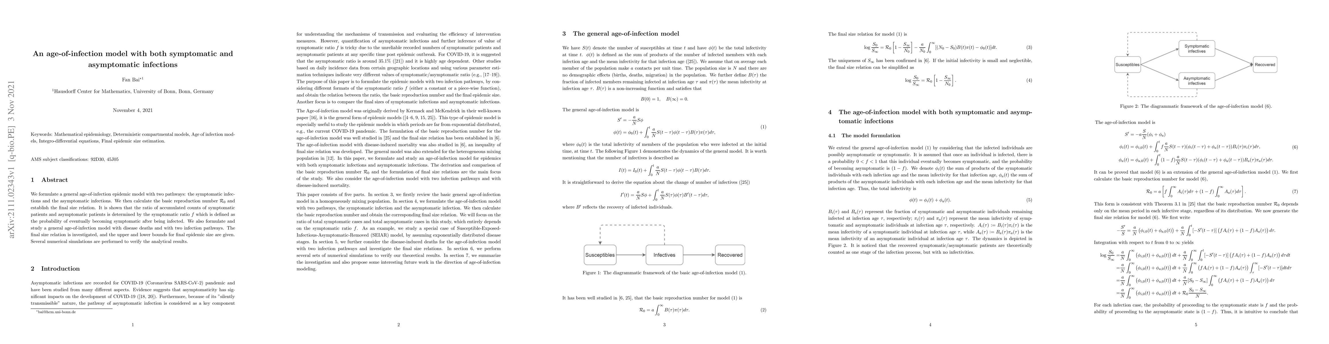 This paper presents an age-of-infection model for epidemics with both symptomatic and asymptomatic pathways, calculating the basic reproduction number $\mathcal{R}_0$ and establishing the final size relation. It determines the ratio of symptomatic to asymptomatic patients based on the symptomatic ratio $f$ and provides bounds for the final epidemic size, verified through numerical simulations.
