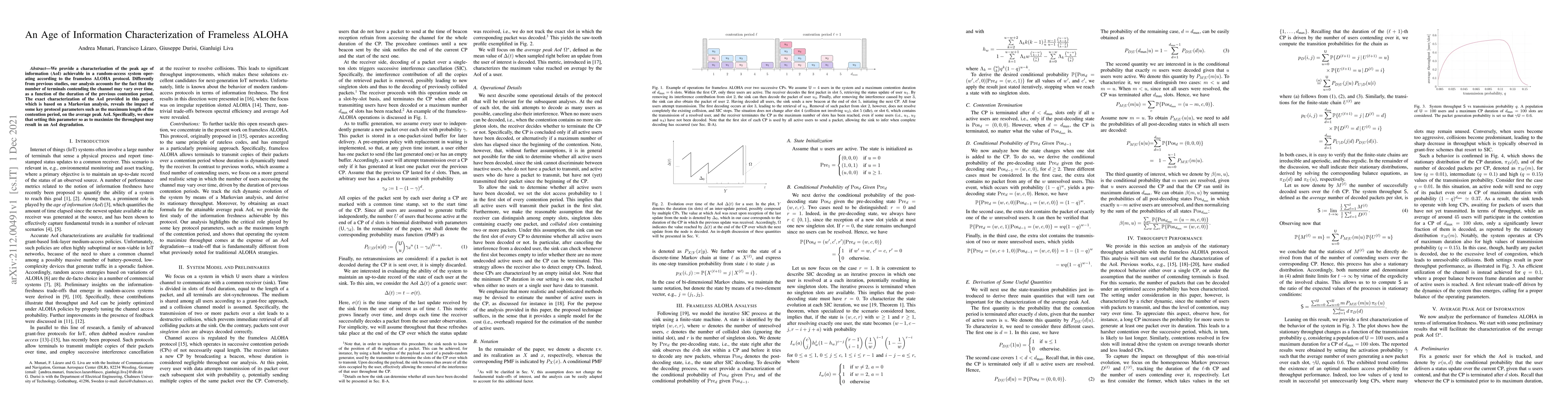 This paper characterizes the peak age of information (AoI) in a frameless ALOHA protocol, accounting for varying numbers of contending terminals. It reveals that optimizing throughput may degrade AoI, highlighting the impact of key protocol parameters.