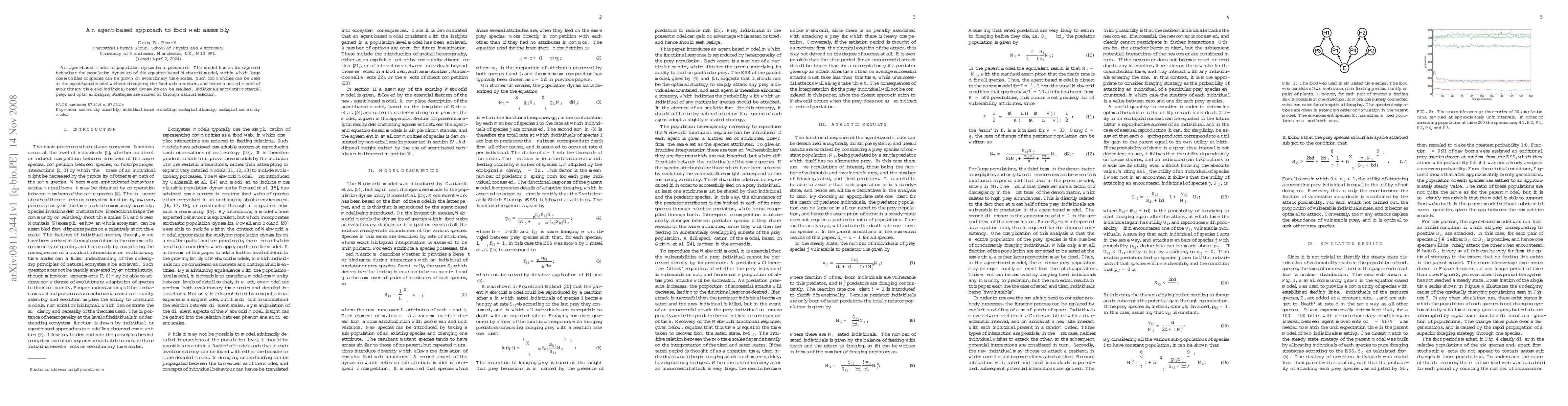 This paper introduces an agent-based model simulating population dynamics and food web assembly, aligning with the Webworld model's evolutionary time scale. The model allows large species communities to develop while maintaining food web structure, employing natural selection for optimal foraging strategies.