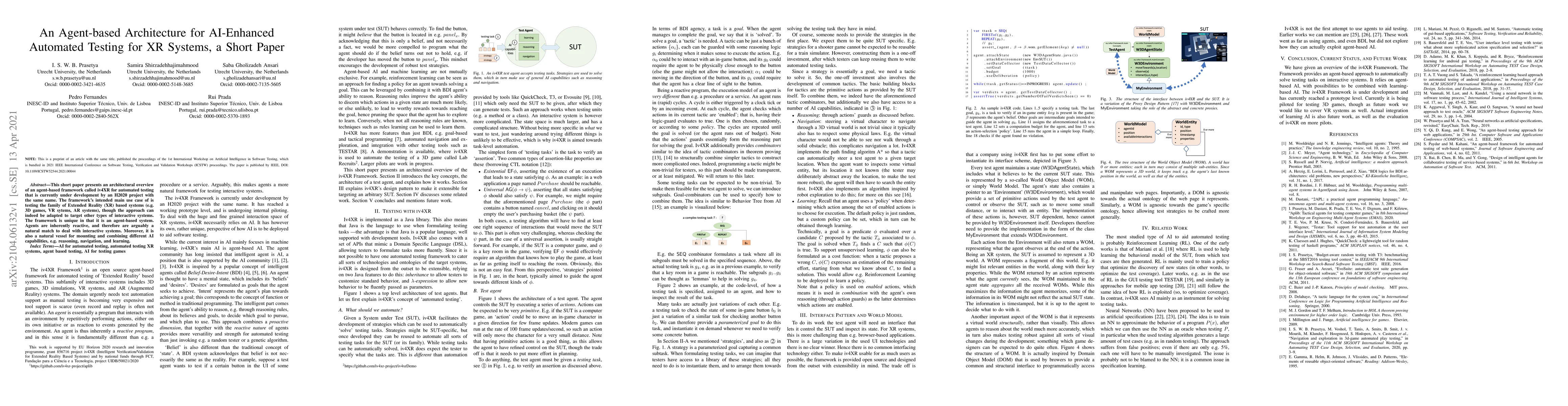 This short paper introduces an agent-based framework named iv4XR for AI-enhanced automated testing of Extended Reality (XR) systems, developed under an H2020 project. The framework leverages reactive agents to naturally handle interactive systems and integrates various AI capabilities for comprehensive testing.