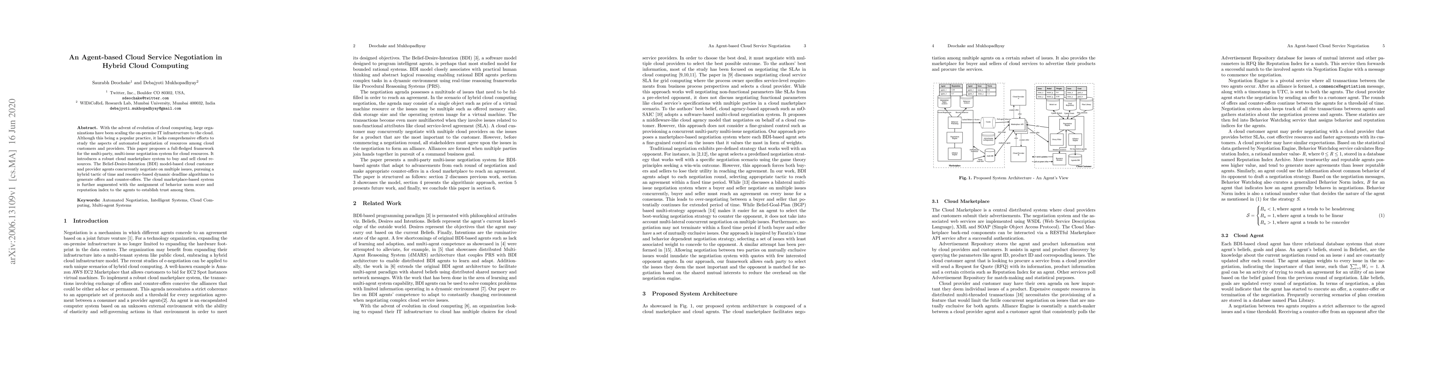 The paper proposes a framework for multi-party, multi-issue negotiation of cloud resources using BDI agents, employing a hybrid tactic of time and resource-based dynamic deadline algorithms for generating offers and counter-offers.