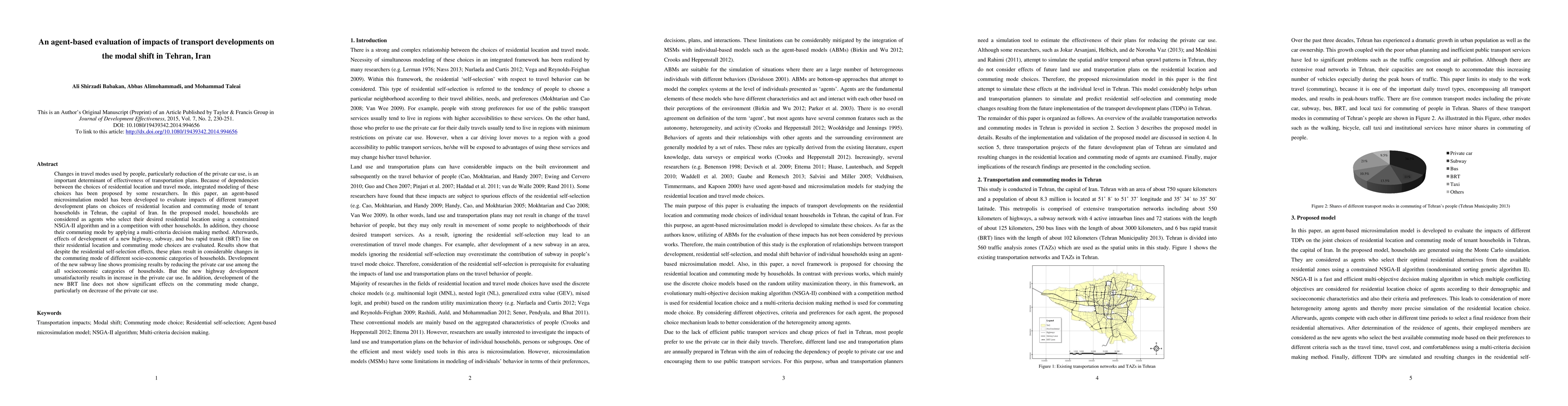 This paper develops an agent-based microsimulation model to evaluate the impact of transport developments on modal shift in Tehran, Iran. The model shows that new subway development significantly reduces private car use across socioeconomic groups, while new highway development increases it, and BRT development has minimal effect.