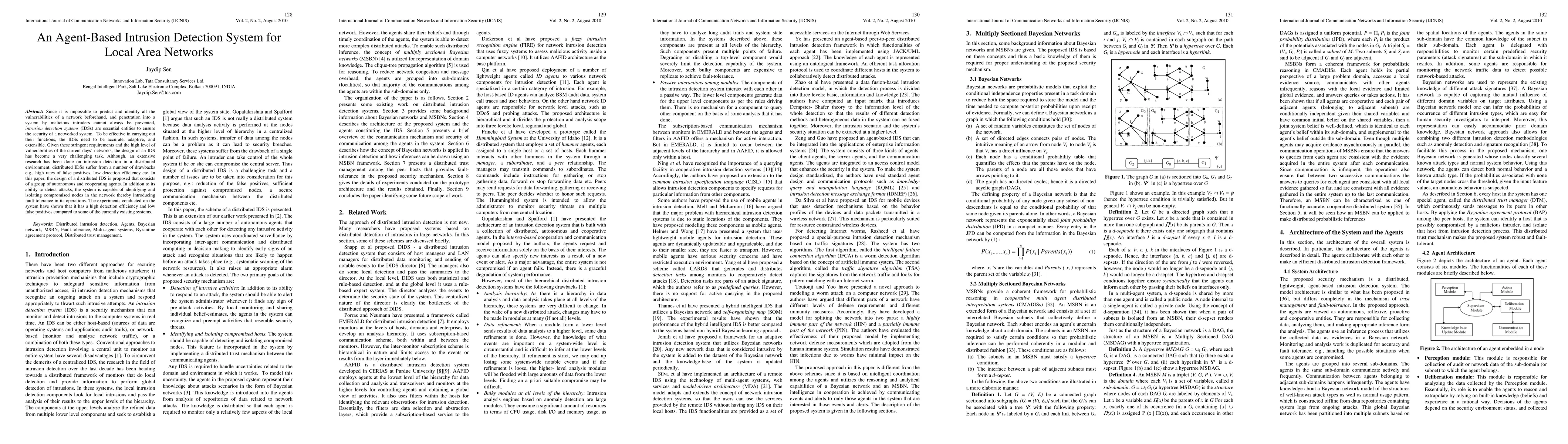 This paper proposes an agent-based intrusion detection system (IDS) for local area networks, featuring autonomous agents that enhance detection accuracy, adaptability, and efficiency while reducing false positives and introducing fault-tolerance by identifying and isolating compromised nodes. Experimental results indicate superior performance compared to existing systems.