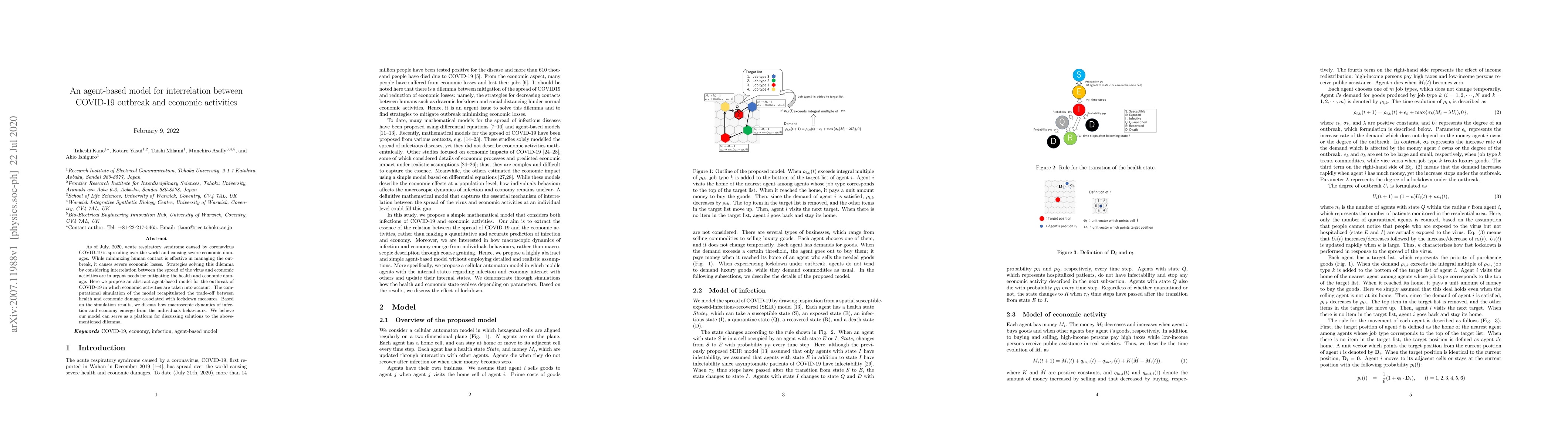 As of July, 2020, acute respiratory syndrome caused by coronavirus COVID-19 is spreading over the world and causing severe economic damages. While minimizing human contact is effective in managing the outbreak, it causes severe economic losses. Strategies solving this dilemma by considering interrelation between the spread of the virus and economic activities are in urgent needs for mitigating the health and economic damage. Here we propose an abstract agent-based model for the outbreak of COVID-19 in which economic activities are taken into account. The computational simulation of the model recapitulated the trade-off between health and economic damage associated with lockdown measures. Based on the simulation results, we discuss how macroscopic dynamics of infection and economy emerge from the individuals' behaviours. We believe our model can serve as a platform for discussing solutions to the abovementioned dilemma.