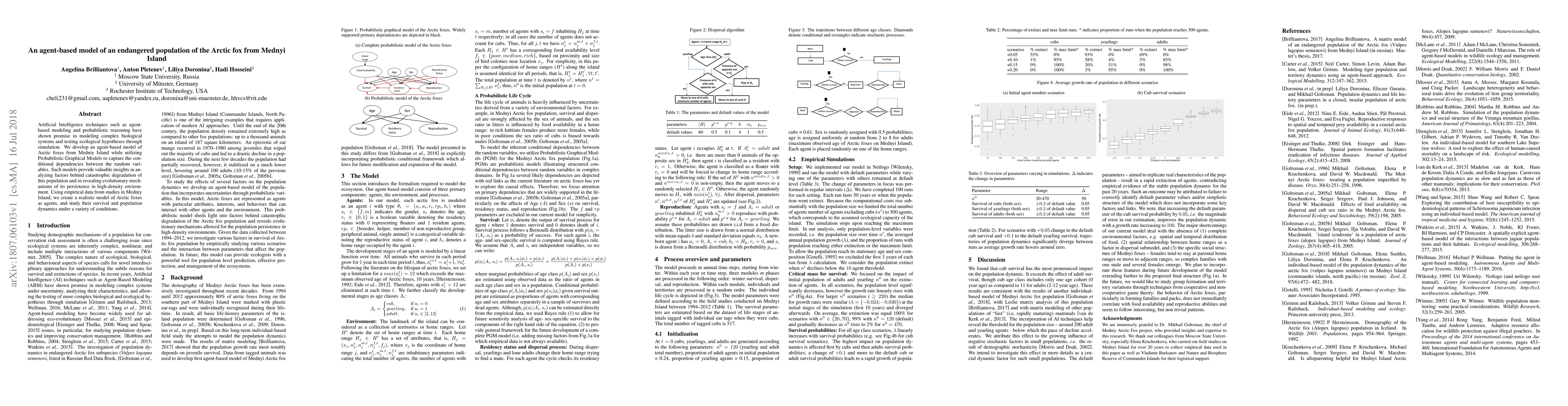 Artificial Intelligence techniques such as agent-based modeling and probabilistic reasoning have shown promise in modeling complex biological systems and testing ecological hypotheses through simulation. We develop an agent-based model of Arctic foxes from Medniy Island while utilizing Probabilistic Graphical Models to capture the conditional dependencies between the random variables. Such models provide valuable insights in analyzing factors behind catastrophic degradation of this population and in revealing evolutionary mechanisms of its persistence in high-density environment. Using empirical data from studies in Medniy Island, we create a realistic model of Arctic foxes as agents, and study their survival and population dynamics under a variety of conditions.