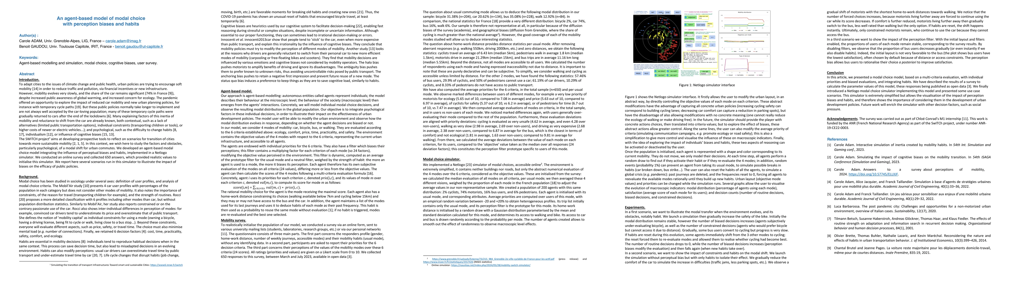 Summary: This paper develops an agent-based model in Netlogo to simulate mobility choices, incorporating human habits and perception biases derived from an online survey, and allows users to adjust urban infrastructure to observe modal shifts. The model aims to better understand and predict human mobility behaviors.