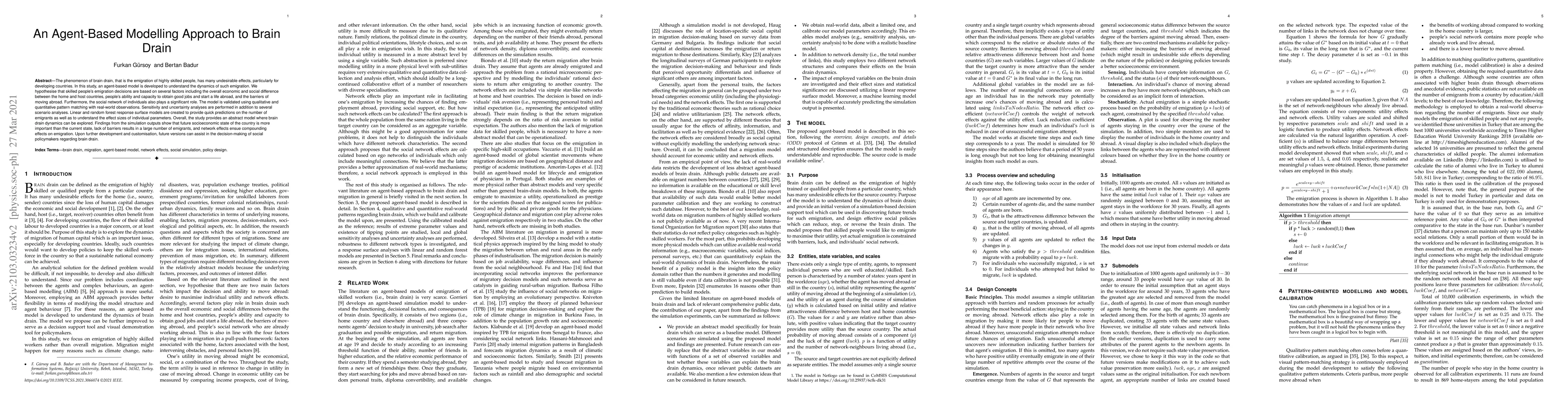 This paper develops an agent-based model to explore the dynamics of brain drain, focusing on emigration decisions influenced by economic, social factors, and social networks. The model's findings suggest that future socioeconomic conditions and reduced barriers significantly impact emigration, with network effects amplifying these trends.