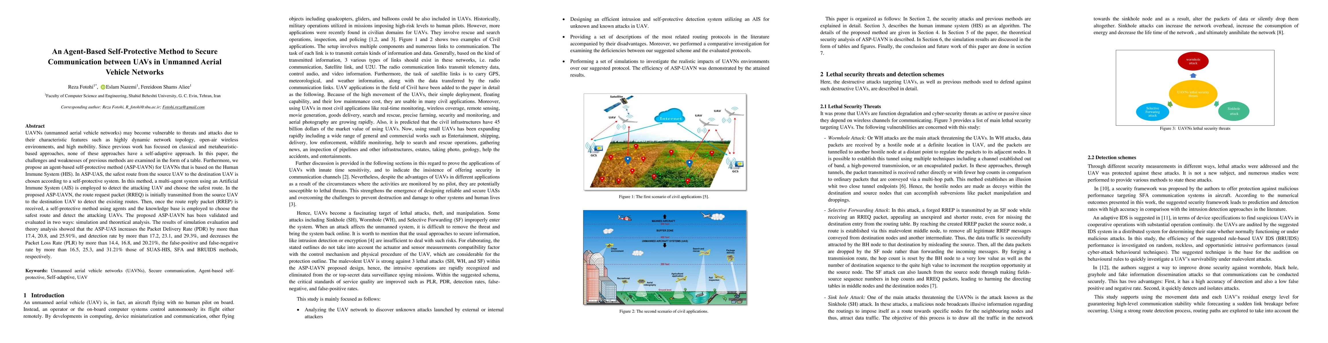 Researchers propose an agent-based self-protective method to secure communication between UAVs in unmanned aerial vehicle networks, achieving significant improvements in packet delivery rate, detection rate, and reduced packet loss.