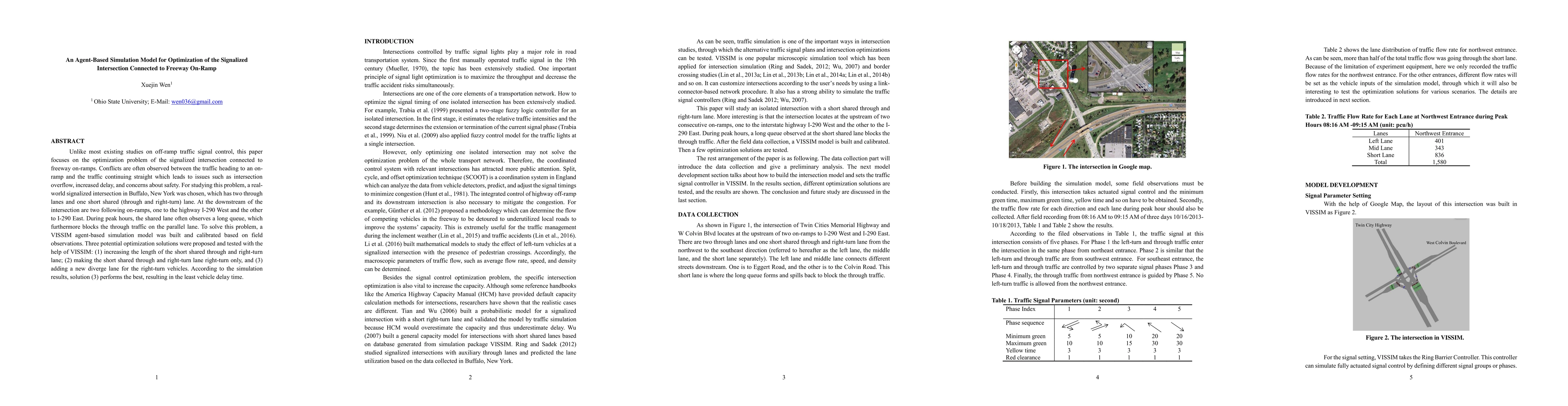 Unlike most existing studies on off-ramp traffic signal control, this paper focuses on the optimization problem of the signalized intersection connected to freeway on-ramps. Conflicts are often observed between the traffic heading to an on-ramp and the traffic continuing straight which leads to issues such as intersection overflow, increased delay, and concerns about safety. For studying this problem, a real-world signalized intersection in Buffalo, New York was chosen, which has two through lanes and one short shared (through and right-turn) lane. At the downstream of the intersection are two following on-ramps, one to the highway I-290 West and the other to I-290 East. During peak hours, the shared lane often observes a long queue, which furthermore blocks the through traffic on the parallel lane. To solve this problem, a VISSIM agent-based simulation model was built and calibrated based on field observations. Three potential optimization solutions were proposed and tested with the help of VISSIM: (1) increasing the length of the short shared through and right-turn lane; (2) making the short shared through and right-turn lane right-turn only, and (3) adding a new diverge lane for the right-turn vehicles. According to the simulation results, solution (3) performs the best, resulting in the least vehicle delay time.