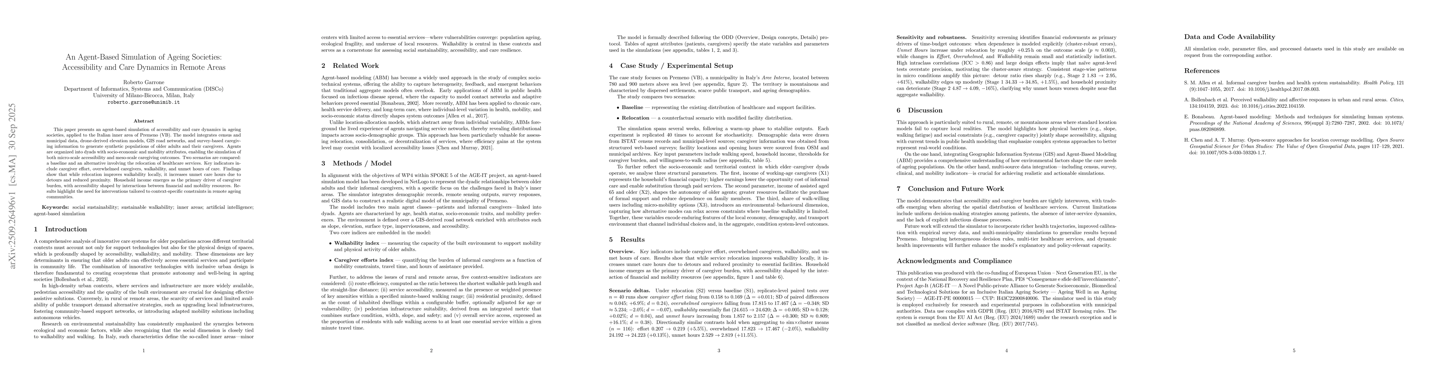 This paper presents an agent-based simulation of accessibility and care dynamics in ageing societies, applied to the Italian inner area of Premeno (VB). The model integrates census and municipal data, drone-derived elevation models, GIS road networks, and survey-based caregiving information to generate synthetic populations of older adults and their caregivers. Agents are organized into dyads with socio-economic and mobility attributes, enabling the simulation of both micro-scale accessibility and meso-scale caregiving outcomes. Two scenarios are compared: a baseline and an alternative involving the relocation of healthcare services. Key indicators include caregiver effort, overwhelmed caregivers, walkability, and unmet hours of care. Findings show that while relocation improves walkability locally, it increases unmet care hours due to detours and reduced proximity. Household income emerges as the primary driver of caregiver burden, with accessibility shaped by interactions between financial and mobility resources. Results highlight the need for interventions tailored to context-specific constraints in remote ageing communities.