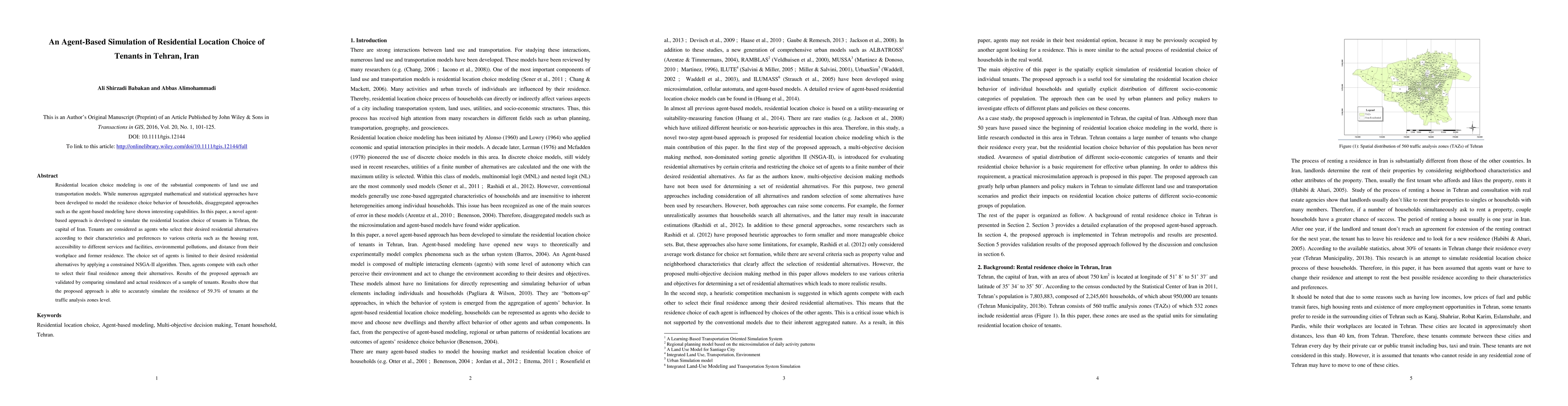 This paper develops an agent-based simulation to model residential location choice of tenants in Tehran, Iran, using tenants as agents selecting residences based on factors like rent, accessibility, and pollution. The model's accuracy is validated by comparing simulated results to actual tenant residences, showing a 59.3% match.