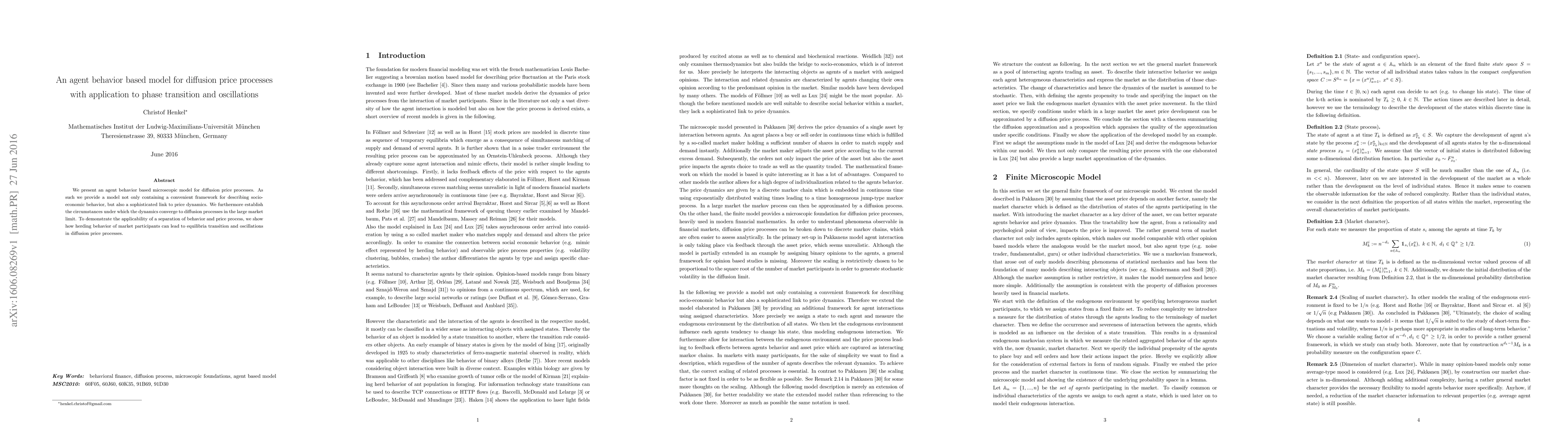 We present an agent behavior based microscopic model for diffusion price processes. As such we provide a model not only containing a convenient framework for describing socio-economic behavior, but also a sophisticated link to price dynamics. We furthermore establish the circumstances under which the dynamics converge to diffusion processes in the large market limit. To demonstrate the applicability of a separation of behavior and price process, we show how herding behavior of market participants can lead to equilibria transition and oscillations in diffusion price processes.