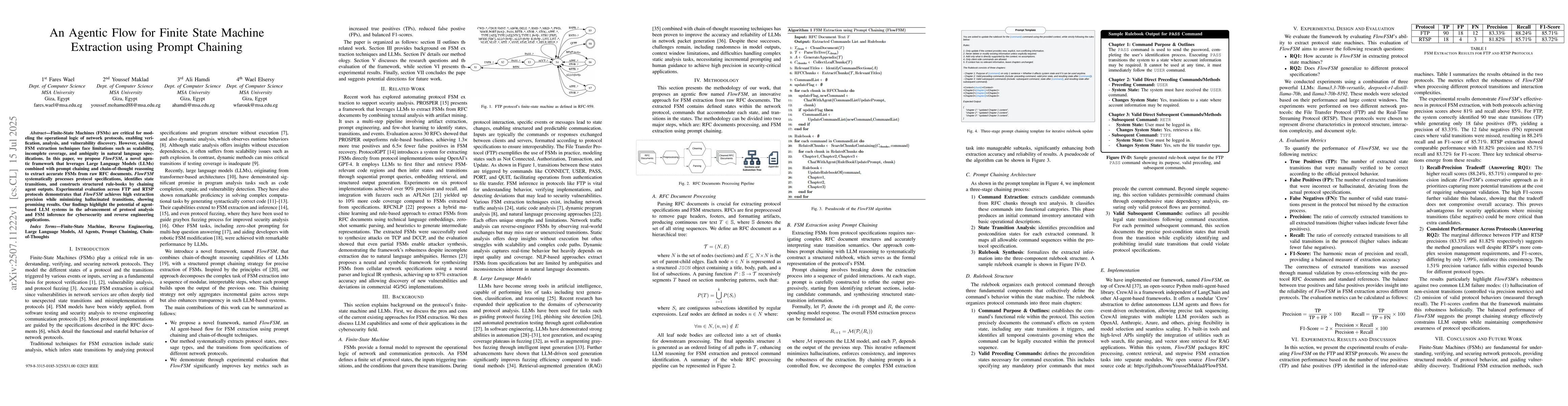 Finite-State Machines (FSMs) are critical for modeling the operational logic of network protocols, enabling verification, analysis, and vulnerability discovery. However, existing FSM extraction techniques face limitations such as scalability, incomplete coverage, and ambiguity in natural language specifications. In this paper, we propose FlowFSM, a novel agentic framework that leverages Large Language Models (LLMs) combined with prompt chaining and chain-of-thought reasoning to extract accurate FSMs from raw RFC documents. FlowFSM systematically processes protocol specifications, identifies state transitions, and constructs structured rule-books by chaining agent outputs. Experimental evaluation across FTP and RTSP protocols demonstrates that FlowFSM achieves high extraction precision while minimizing hallucinated transitions, showing promising results. Our findings highlight the potential of agent-based LLM systems in the advancement of protocol analysis and FSM inference for cybersecurity and reverse engineering applications.