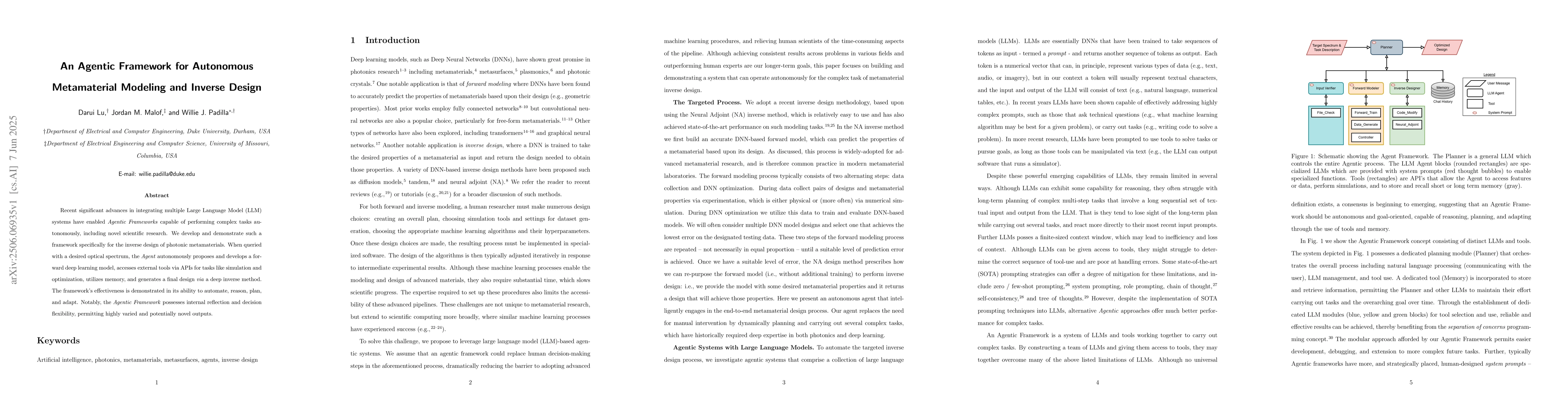 Recent significant advances in integrating multiple Large Language Model (LLM) systems have enabled Agentic Frameworks capable of performing complex tasks autonomously, including novel scientific research. We develop and demonstrate such a framework specifically for the inverse design of photonic metamaterials. When queried with a desired optical spectrum, the Agent autonomously proposes and develops a forward deep learning model, accesses external tools via APIs for tasks like simulation and optimization, utilizes memory, and generates a final design via a deep inverse method. The framework's effectiveness is demonstrated in its ability to automate, reason, plan, and adapt. Notably, the Agentic Framework possesses internal reflection and decision flexibility, permitting highly varied and potentially novel outputs.