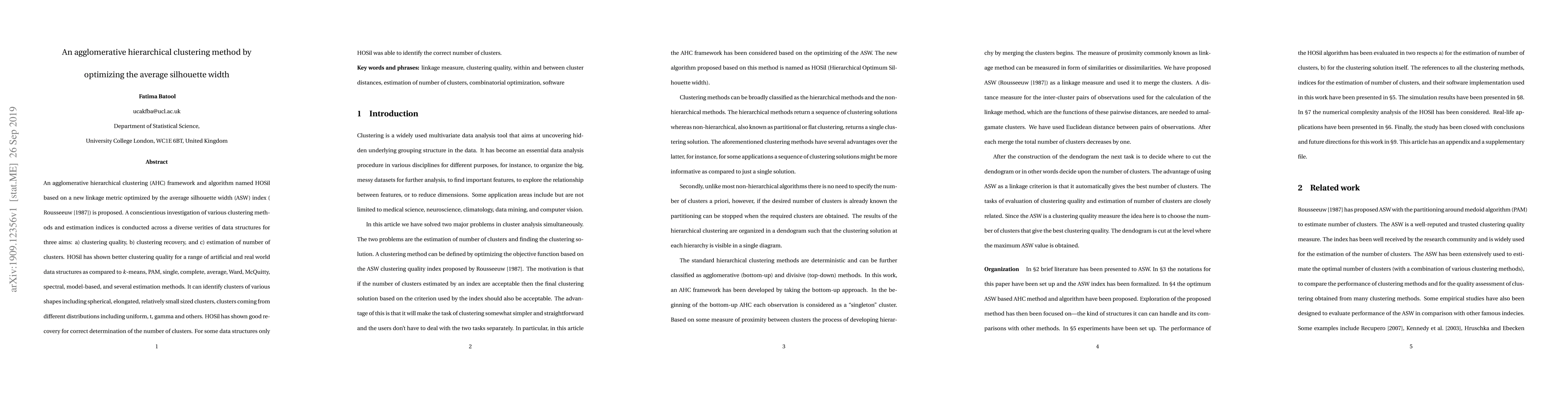An agglomerative hierarchical clustering (AHC) framework and algorithm named HOSil based on a new linkage metric optimized by the average silhouette width (ASW) index is proposed. A conscientious investigation of various clustering methods and estimation indices is conducted across a diverse verities of data structures for three aims: a) clustering quality, b) clustering recovery, and c) estimation of number of clusters. HOSil has shown better clustering quality for a range of artificial and real world data structures as compared to k-means, PAM, single, complete, average, Ward, McQuitty, spectral, model-based, and several estimation methods. It can identify clusters of various shapes including spherical, elongated, relatively small sized clusters, clusters coming from different distributions including uniform, t, gamma and others. HOSil has shown good recovery for correct determination of the number of clusters. For some data structures only HOSil was able to identify the correct number of clusters.