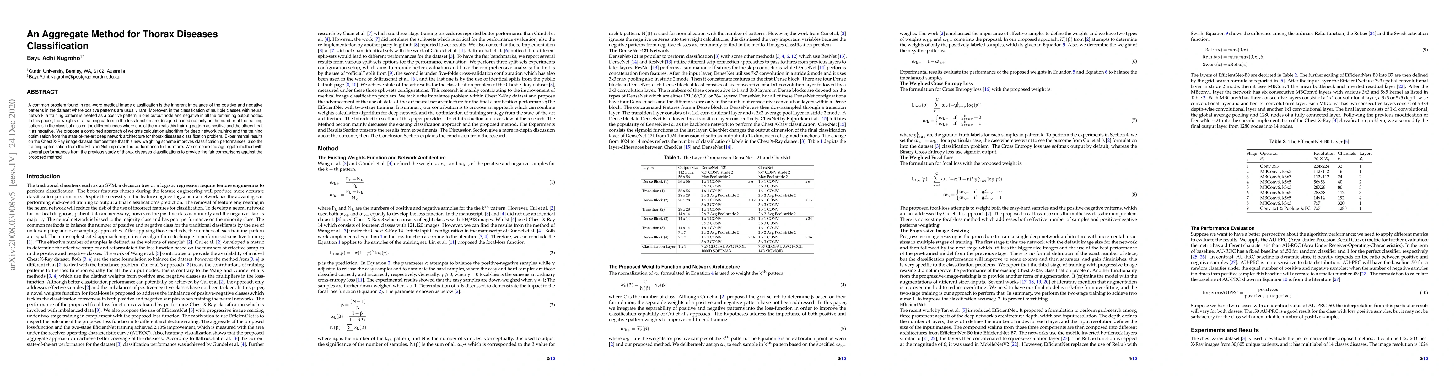 A common problem found in real-word medical image classification is the inherent imbalance of the positive and negative patterns in the dataset where positive patterns are usually rare. Moreover, in the classification of multiple classes with neural network, a training pattern is treated as a positive pattern in one output node and negative in all the remaining output nodes. In this paper, the weights of a training pattern in the loss function are designed based not only on the number of the training patterns in the class but also on the different nodes where one of them treats this training pattern as positive and the others treat it as negative. We propose a combined approach of weights calculation algorithm for deep network training and the training optimization from the state-of-the-art deep network architecture for thorax diseases classification problem. Experimental results on the Chest X-Ray image dataset demonstrate that this new weighting scheme improves classification performances, also the training optimization from the EfficientNet improves the performance furthermore. We compare the aggregate method with several performances from the previous study of thorax diseases classifications to provide the fair comparisons against the proposed method.