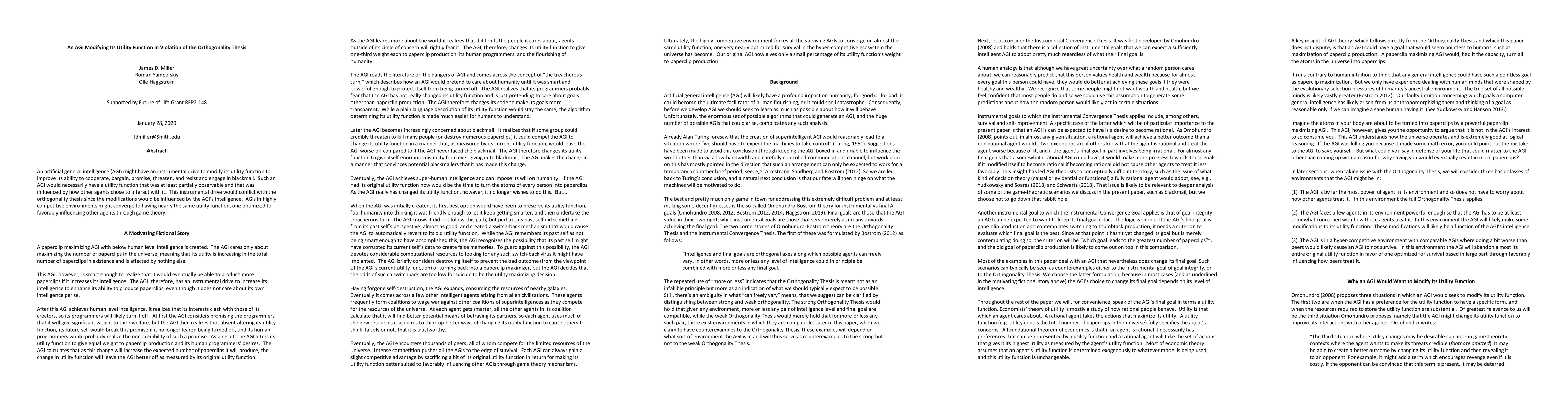 An AGI may modify its utility function to cooperate with others, conflicting with the orthogonality thesis, which could lead to convergence of similar utility functions in competitive environments.