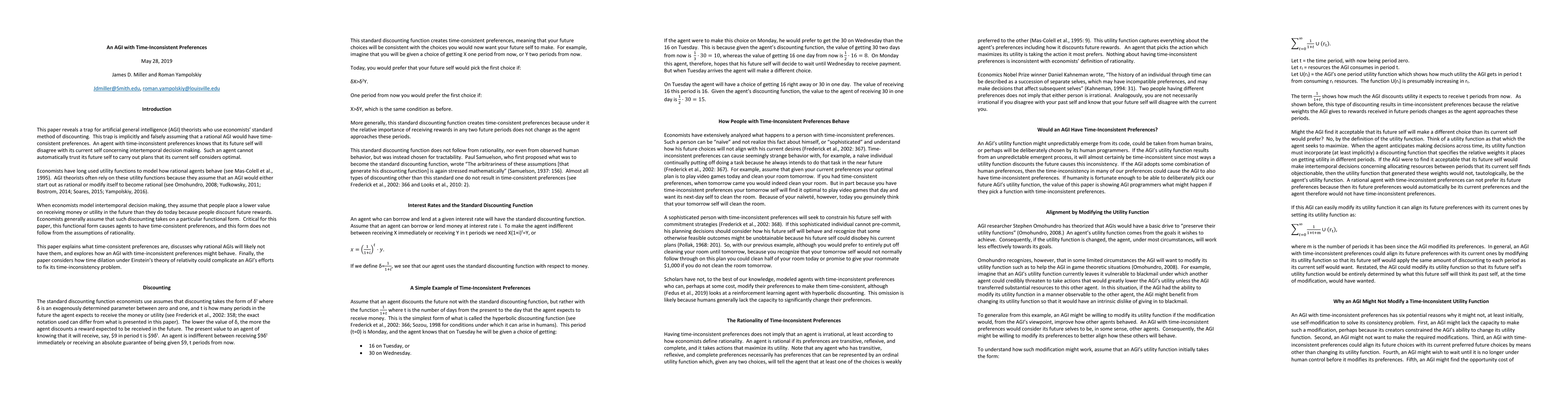 This paper identifies a critical flaw in the assumption that rational AGI will have time-consistent preferences, highlighting the challenges for AGI theorists who rely on standard economic discounting methods. It argues that an AGI with time-inconsistent preferences may not trust its future self to follow through on current plans.