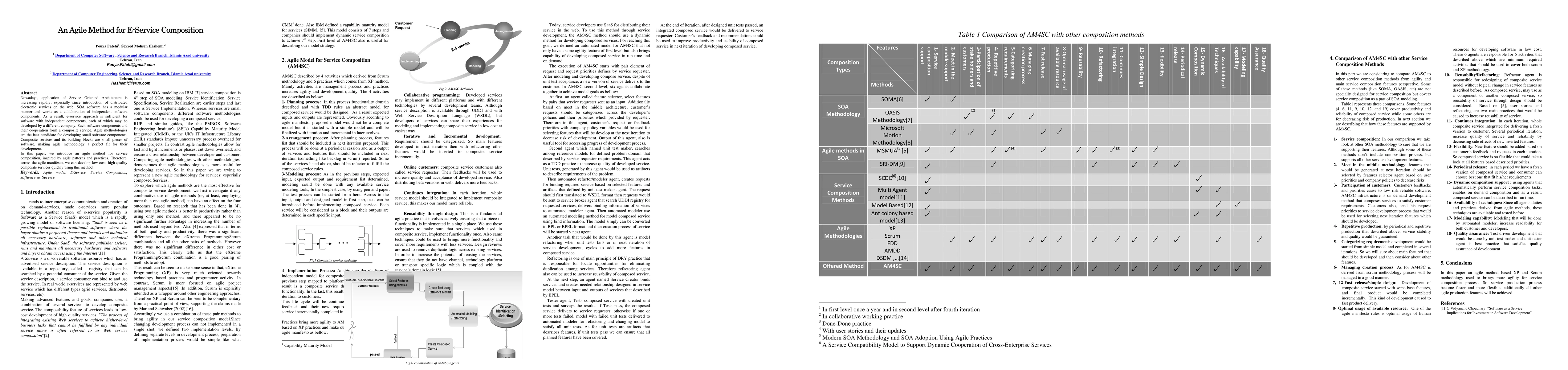 Nowadays, application of Service Oriented Architecture is increasing rapidly; especially since introduction of distributed electronic services on the web. SOA software has a modular manner and works as a collaboration of independent software components. As a result, e-service approach is sufficient for software with independent components, each of which may be developed by a different company. Such software components and their cooperation form a composite service. Agile methodologies are the best candidate for developing small software components. Composite services and its building blocks are small pieces of software, making agile methodology a perfect fit for their development. In this paper, we introduce an agile method for service composition, inspired by agile patterns and practices. Therefore, across the agile manifesto, we can develop low cost, high quality composite services quickly using this method.