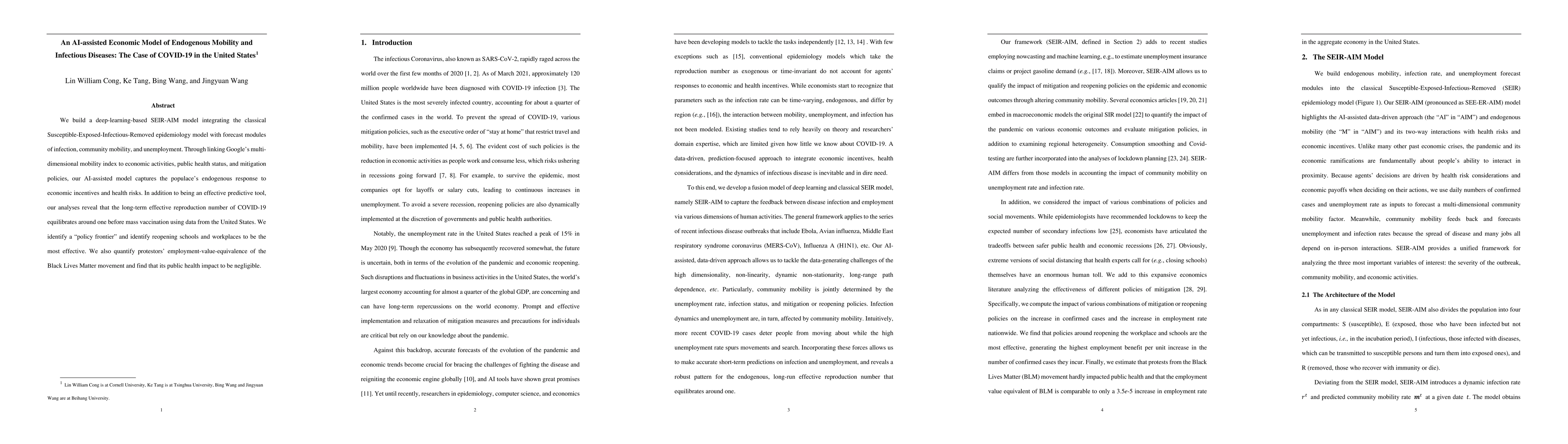 We build a deep-learning-based SEIR-AIM model integrating the classical Susceptible-Exposed-Infectious-Removed epidemiology model with forecast modules of infection, community mobility, and unemployment. Through linking Google's multi-dimensional mobility index to economic activities, public health status, and mitigation policies, our AI-assisted model captures the populace's endogenous response to economic incentives and health risks. In addition to being an effective predictive tool, our analyses reveal that the long-term effective reproduction number of COVID-19 equilibrates around one before mass vaccination using data from the United States. We identify a "policy frontier" and identify reopening schools and workplaces to be the most effective. We also quantify protestors' employment-value-equivalence of the Black Lives Matter movement and find that its public health impact to be negligible.