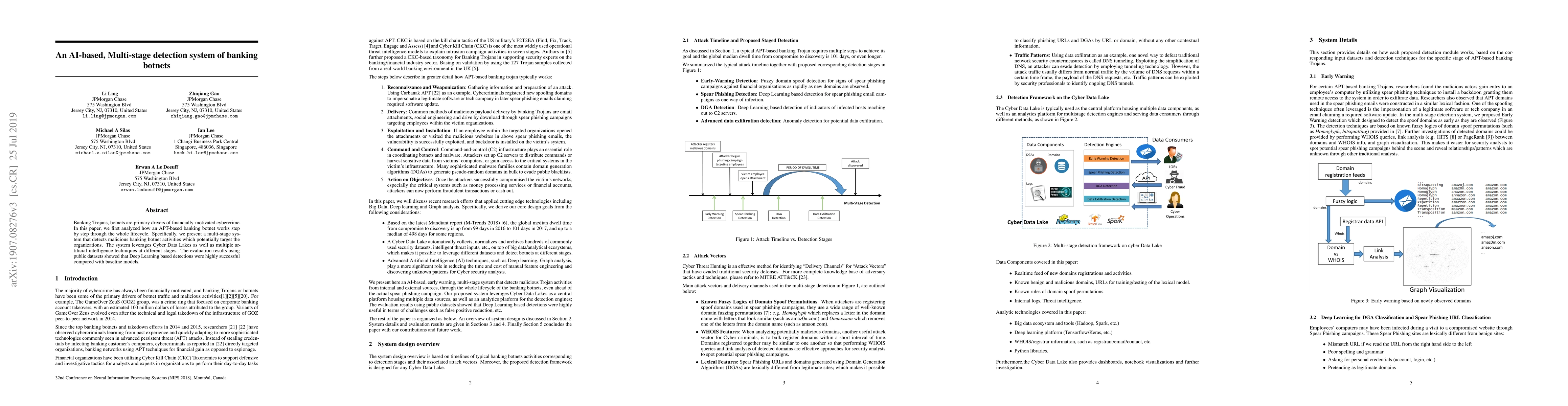 This paper proposes an AI-based, multi-stage detection system for banking botnets, analyzing their lifecycle and employing Cyber Data Lake and various AI techniques for detection. Evaluations show that deep learning methods outperform baseline models in identifying malicious activities.