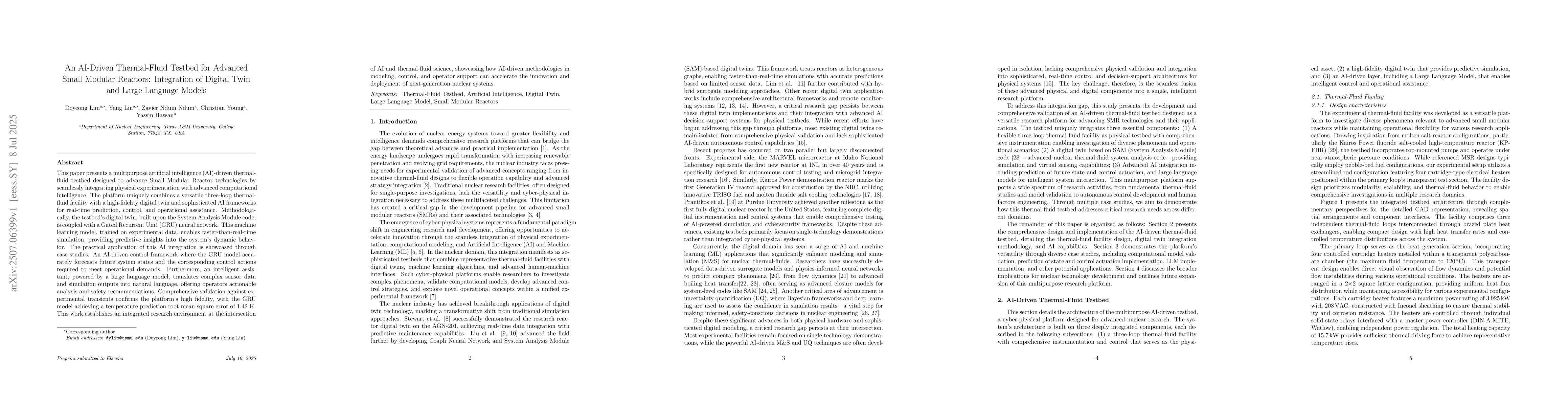 This paper presents a multipurpose artificial intelligence (AI)-driven thermal-fluid testbed designed to advance Small Modular Reactor technologies by seamlessly integrating physical experimentation with advanced computational intelligence. The platform uniquely combines a versatile three-loop thermal-fluid facility with a high-fidelity digital twin and sophisticated AI frameworks for real-time prediction, control, and operational assistance. Methodologically, the testbed's digital twin, built upon the System Analysis Module code, is coupled with a Gated Recurrent Unit (GRU) neural network. This machine learning model, trained on experimental data, enables faster-than-real-time simulation, providing predictive insights into the system's dynamic behavior. The practical application of this AI integration is showcased through case studies. An AI-driven control framework where the GRU model accurately forecasts future system states and the corresponding control actions required to meet operational demands. Furthermore, an intelligent assistant, powered by a large language model, translates complex sensor data and simulation outputs into natural language, offering operators actionable analysis and safety recommendations. Comprehensive validation against experimental transients confirms the platform's high fidelity, with the GRU model achieving a temperature prediction root mean square error of 1.42 K. This work establishes an integrated research environment at the intersection of AI and thermal-fluid science, showcasing how AI-driven methodologies in modeling, control, and operator support can accelerate the innovation and deployment of next-generation nuclear systems.