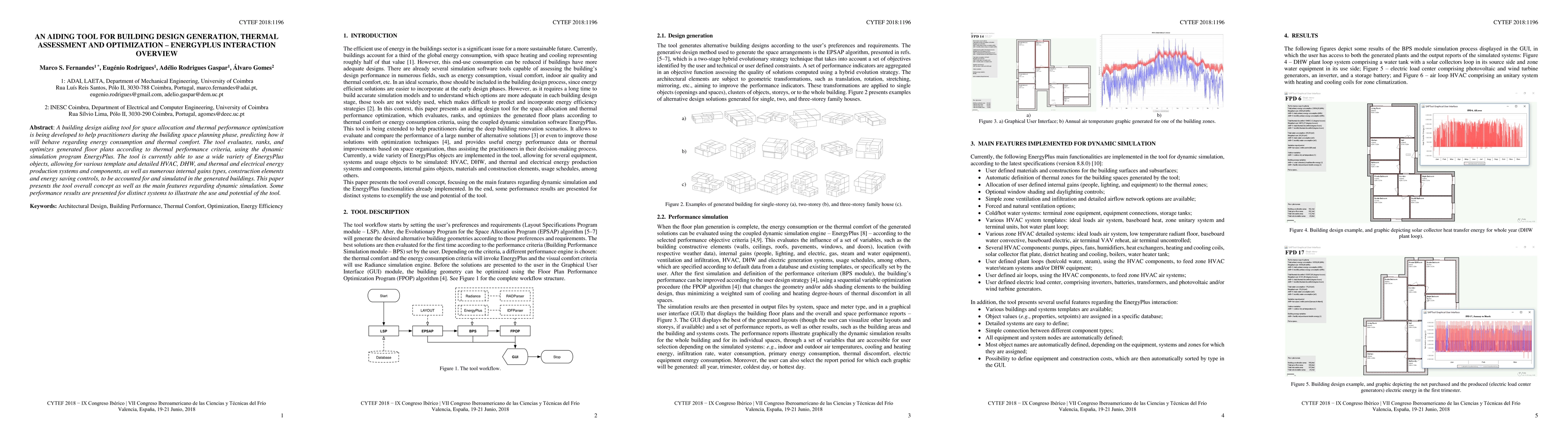 A building design aiding tool for space allocation and thermal performance optimization is being developed to help practitioners during the building space planning phase, predicting how it will behave regarding energy consumption and thermal comfort. The tool evaluates, ranks, and optimizes generated floor plans according to thermal performance criteria, using the dynamic simulation program EnergyPlus. The tool is currently able to use a wide variety of EnergyPlus objects, allowing for various template and detailed HVAC, DHW, and thermal and electrical energy production systems and components, as well as numerous internal gains types, construction elements and energy saving controls, to be accounted for and simulated in the generated buildings. This paper presents the tool overall concept as well as the main features regarding dynamic simulation. Some performance results are presented for distinct systems to illustrate the use and potential of the tool.