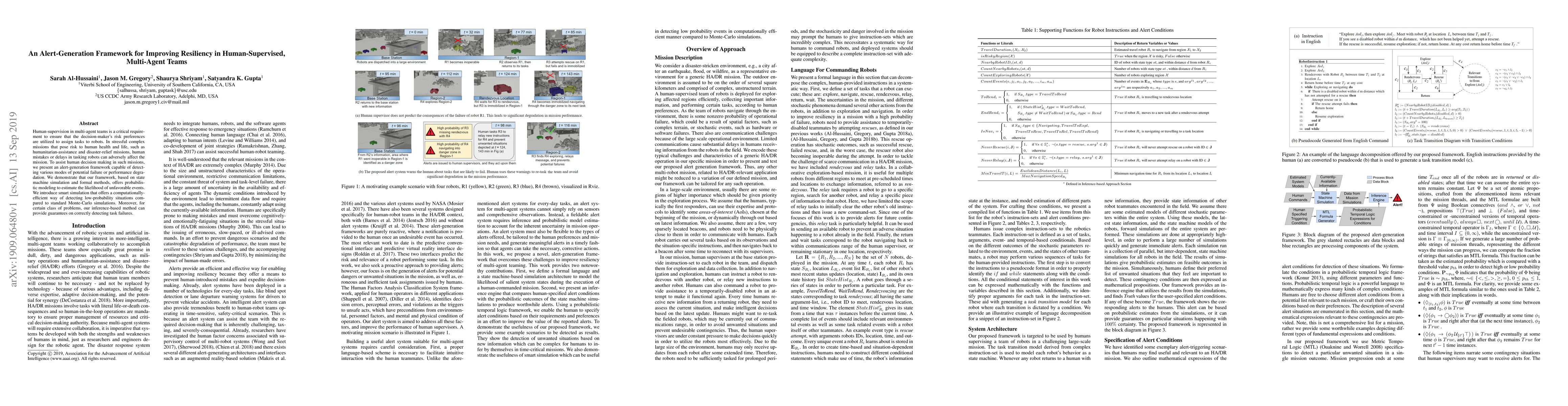 Human-supervision in multi-agent teams is a critical requirement to ensure that the decision-maker's risk preferences are utilized to assign tasks to robots. In stressful complex missions that pose risk to human health and life, such as humanitarian-assistance and disaster-relief missions, human mistakes or delays in tasking robots can adversely affect the mission. To assist human decision making in such missions, we present an alert-generation framework capable of detecting various modes of potential failure or performance degradation. We demonstrate that our framework, based on state machine simulation and formal methods, offers probabilistic modeling to estimate the likelihood of unfavorable events. We introduce smart simulation that offers a computationally-efficient way of detecting low-probability situations compared to standard Monte-Carlo simulations. Moreover, for certain class of problems, our inference-based method can provide guarantees on correctly detecting task failures.