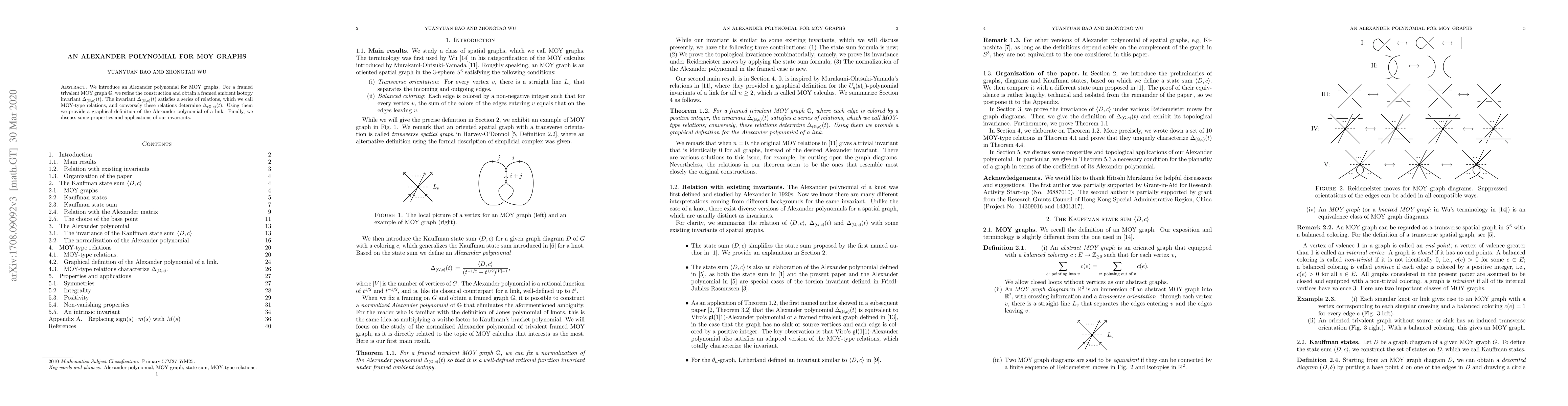 The paper introduces an Alexander polynomial for MOY graphs, defined for a framed trivalent MOY graph \(\mathbb{G}\) as \(\Delta_{(\mathbb{G},c)}(t)\). This invariant satisfies MOY-type relations, which are both necessary and sufficient for determining \(\Delta_{(\mathbb{G},c)}(t)\). The construction refines existing methods and provides a graphical definition of the Alexander polynomial of a link.