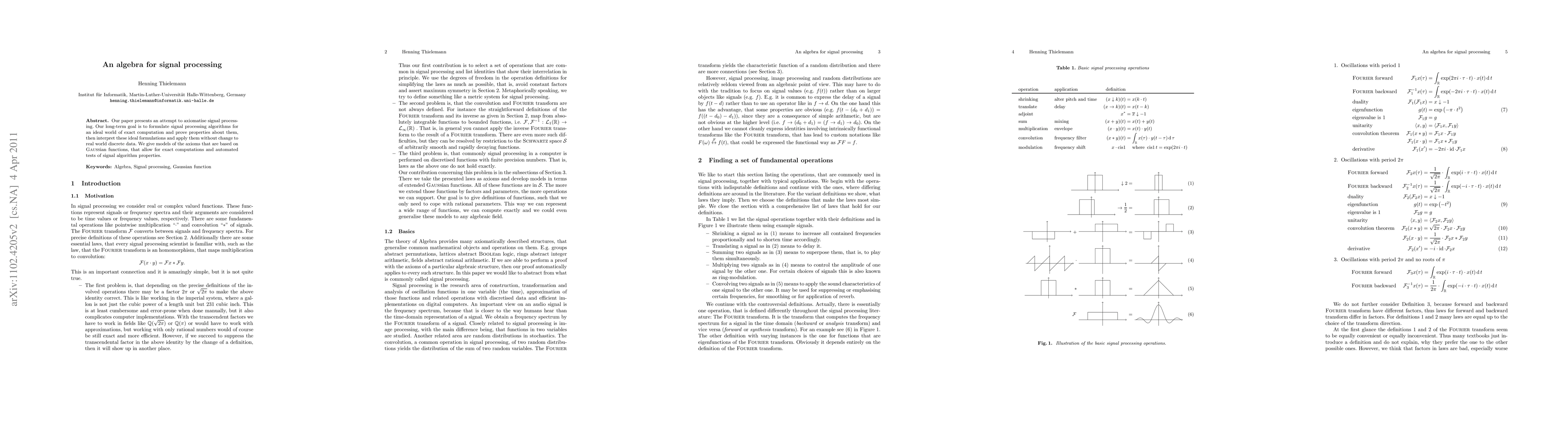 Our paper presents an attempt to axiomatise signal processing. Our long-term goal is to formulate signal processing algorithms for an ideal world of exact computation and prove properties about them, then interpret these ideal formulations and apply them without change to real world discrete data. We give models of the axioms that are based on Gaussian functions, that allow for exact computations and automated tests of signal algorithm properties.
