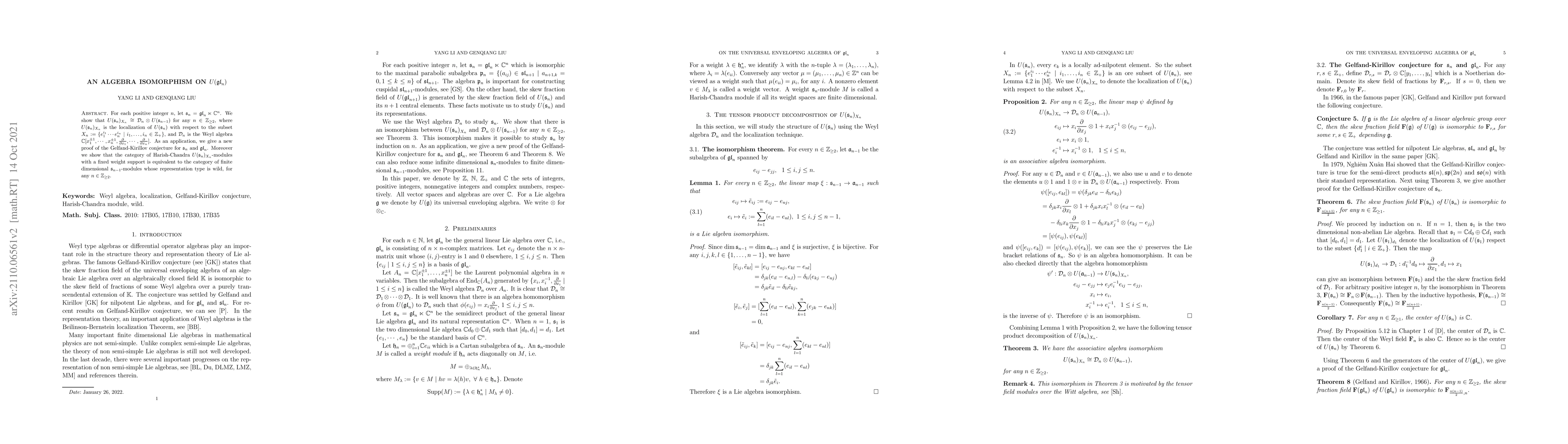 For each positive integer $n$, let $\mathfrak{s}_n=\mathfrak{gl}_n\ltimes \mathbb{C}^n$. We show that $U(\mathfrak{s}_{n})_{X_{n}}\cong \mathcal{D}_{n}\otimes U(\mathfrak{s}_{n-1})$ for any $n\in\mathbb{Z}_{\geq 2}$, where $U(\mathfrak{s}_{n})_{X_{n}}$ is the localization of $U(\mathfrak{s}_{n})$ with respect to the subset $X_n:=\{e_1^{i_1}\cdots e_{n}^{i_{n}}\mid i_1,\dots,i_{n}\in \mathbb{Z}_+\}$, and $\mathcal{D}_{n}$ is the Weyl algebra $\mathbb{C}[x_1^{\pm 1}, \cdots, x_{n}^{\pm 1}, \frac{\partial}{\partial x_1},\cdots, \frac{\partial}{\partial x_{n}}]$. As an application, we give a new proof of the Gelfand-Kirillov conjecture for $\mathfrak{s}_n$ and $\mathfrak{gl}_n$. Moreover we show that the category of Harish-Chandra $U(\mathfrak{s}_{n})_{X_n}$-modules with a fixed weight support is equivalent to the category of finite dimensional $\mathfrak{s}_{n-1}$-modules whose representation type is wild, for any $n\in \mathbb{Z}_{\geq 2}$.