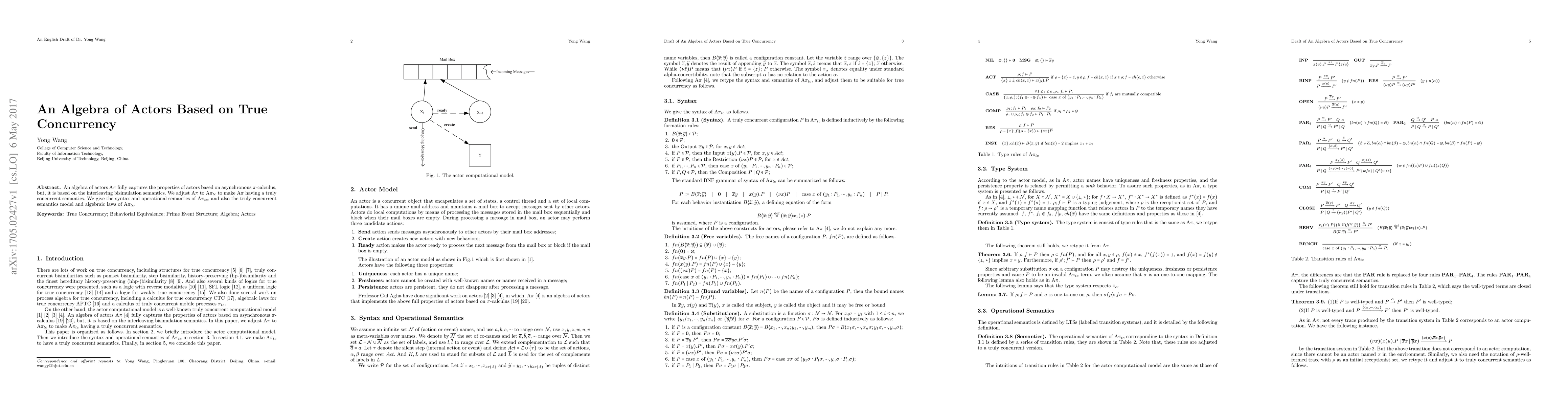 This paper proposes an algebra of actors, $\textrm{A}\pi_{tc}$, based on true concurrency, adjusting the existing $\textrm{A}\pi$ model to reflect true concurrency semantics. It provides the syntax, operational semantics, and algebraic laws for $\textrm{A}\pi_{tc}$.