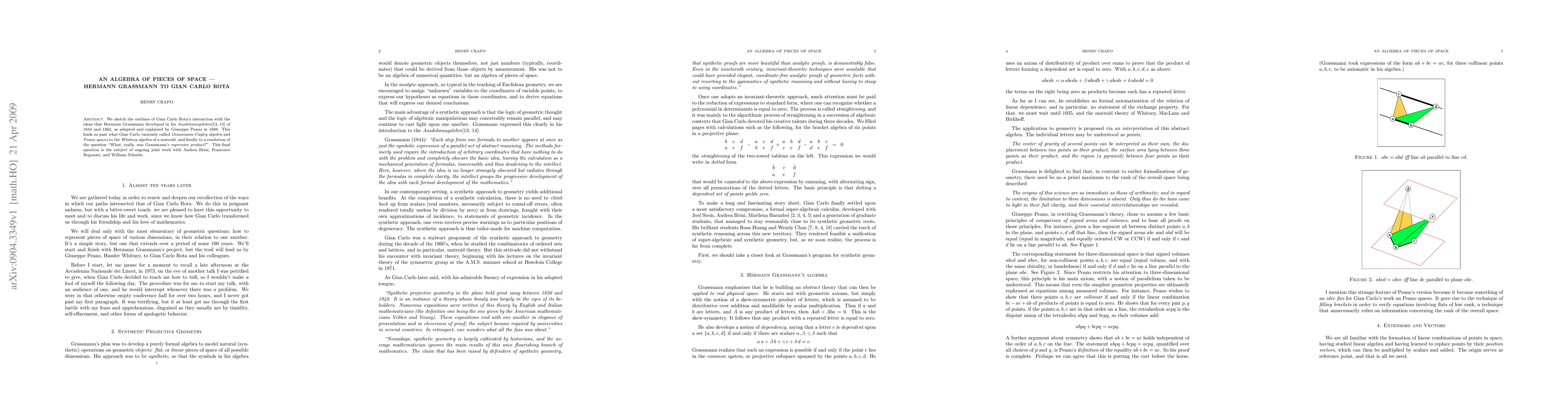 We sketch the outlines of Gian Carlo Rota's interaction with the ideas that Hermann Grassmann developed in his Ausdehnungslehre of 1844 and 1862, as adapted and explained by Giuseppe Peano in 1888. This leads us past what Rota variously called 'Grassmann-Cayley algebra', or 'Peano spaces', to the Whitney algebra of a matroid, and finally to a resolution of the question "What, really, was Grassmann's regressive product?". This final question is the subject of ongoing joint work with Andrea Brini, Francesco Regonati, and William Schmitt. The present paper was presented at the conference "The Digital Footprint of Gian-Carlo Rota: Marbles, Boxes and Philosophy" in Milano on 17 Feb 2009. It will appear in proceedings of that conference, to be published by Springer Verlag.