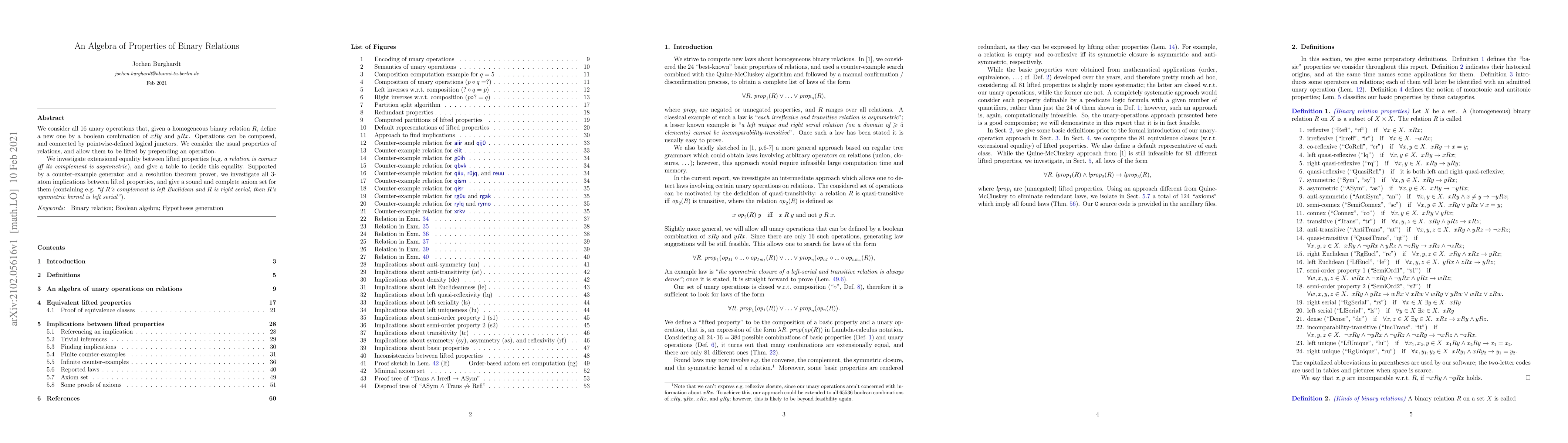 This paper explores 16 unary operations on binary relations, defining new relations via boolean combinations of given relations. It investigates extensional equality among properties of these lifted relations, providing a method to determine such equality and a complete axiom set for 3-atom implications between them.