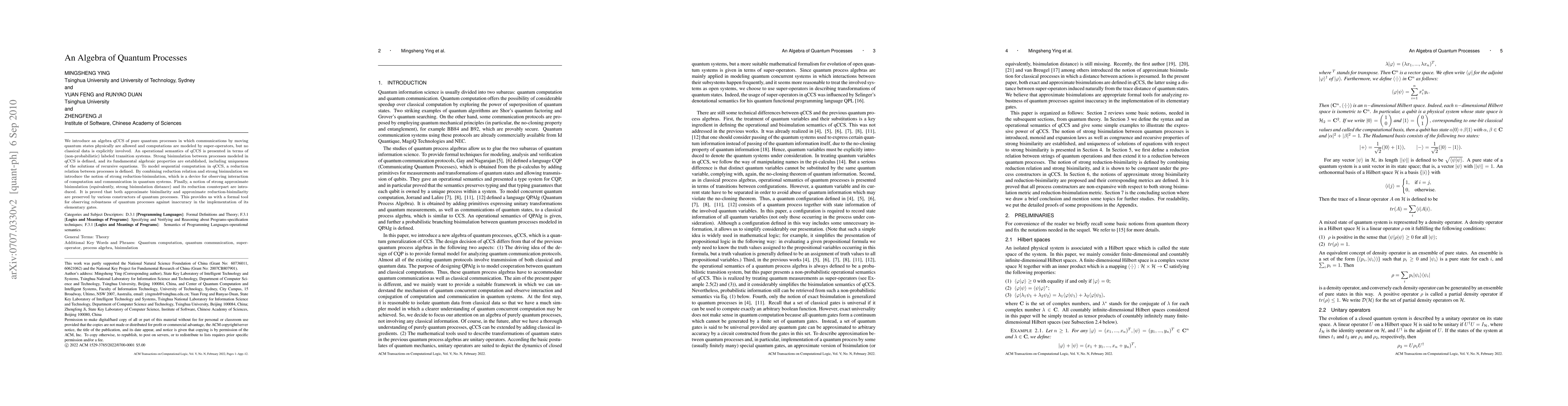 We introduce an algebra qCCS of pure quantum processes in which no classical data is involved, communications by moving quantum states physically are allowed, and computations is modeled by super-operators. An operational semantics of qCCS is presented in terms of (non-probabilistic) labeled transition systems. Strong bisimulation between processes modeled in qCCS is defined, and its fundamental algebraic properties are established, including uniqueness of the solutions of recursive equations. To model sequential computation in qCCS, a reduction relation between processes is defined. By combining reduction relation and strong bisimulation we introduce the notion of strong reduction-bisimulation, which is a device for observing interaction of computation and communication in quantum systems. Finally, a notion of strong approximate bisimulation (equivalently, strong bisimulation distance) and its reduction counterpart are introduced. It is proved that both approximate bisimilarity and approximate reduction-bisimilarity are preserved by various constructors of quantum processes. This provides us with a formal tool for observing robustness of quantum processes against inaccuracy in the implementation of its elementary gates.