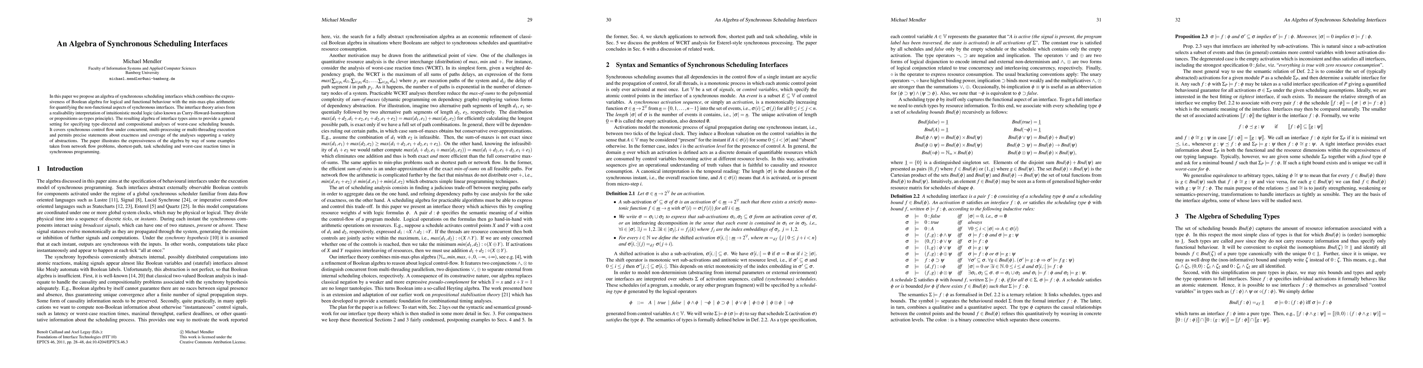 This paper introduces an algebra for synchronous scheduling interfaces that merges Boolean algebra for logical behavior and min-max-plus arithmetic for non-functional aspects, grounded in intuitionistic modal logic. It provides a framework for specifying and analyzing worst-case scheduling bounds in concurrent environments.