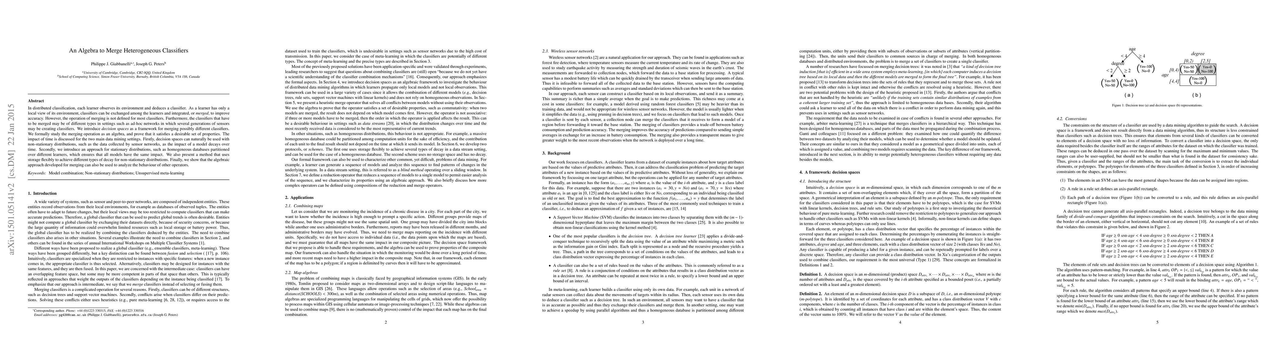 In distributed classification, each learner observes its environment and deduces a classifier. As a learner has only a local view of its environment, classifiers can be exchanged among the learners and integrated, or merged, to improve accuracy. However, the operation of merging is not defined for most classifiers. Furthermore, the classifiers that have to be merged may be of different types in settings such as ad-hoc networks in which several generations of sensors may be creating classifiers. We introduce decision spaces as a framework for merging possibly different classifiers. We formally study the merging operation as an algebra, and prove that it satisfies a desirable set of properties. The impact of time is discussed for the two main data mining settings. Firstly, decision spaces can naturally be used with non-stationary distributions, such as the data collected by sensor networks, as the impact of a model decays over time. Secondly, we introduce an approach for stationary distributions, such as homogeneous databases partitioned over different learners, which ensures that all models have the same impact. We also present a method that uses storage flexibly to achieve different types of decay for non-stationary distributions. Finally, we show that the algebraic approach developed for merging can also be used to analyze the behaviour of other operators.