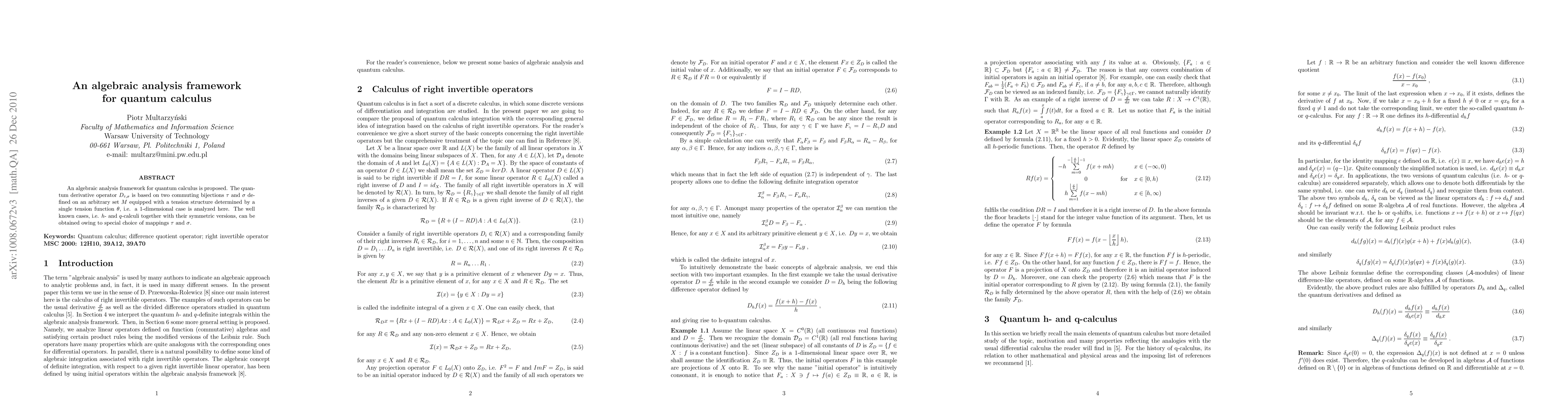 An algebraic analysis framework for quantum calculus is proposed. The quantum derivative operator $D_{\tau ,\sigma}$ is based on two commuting bijections $\tau$ and $\sigma$ defined on an arbitrary set $M$ equipped with a tension structure determined by a single tension function $\theta$, i.e. a 1-dimensional case is analyzed here. The well known cases, i.e. $h$- and $q$-calculi together with their symmetric versions, can be obtained owing to special choice of mappings $\tau$ and $\sigma$.