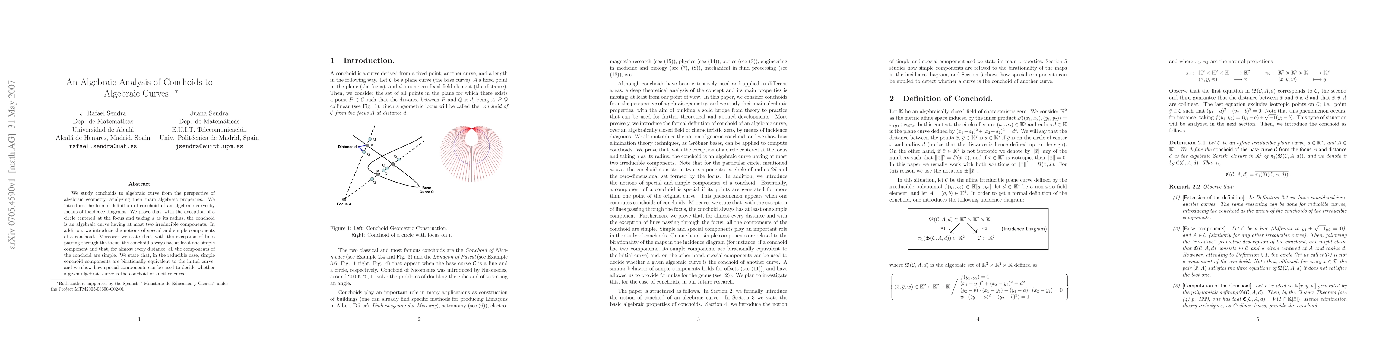 We study conchoids to algebraic curve from the perspective of algebraic geometry, analyzing their main algebraic properties. We introduce the formal definition of conchoid of an algebraic curve by means of incidence diagrams. We prove that, with the exception of a circle centered at the focus and taking $d$ as its radius, the conchoid is an algebraic curve having at most two irreducible components. In addition, we introduce the notions of special and simple components of a conchoid. Moreover we state that, with the exception of lines passing through the focus, the conchoid always has at least one simple component and that, for almost every distance, all the components of the conchoid are simple. We state that, in the reducible case, simple conchoid components are birationally equivalent to the initial curve, and we show how special components can be used to decide whether a given algebraic curve is the conchoid of another curve.