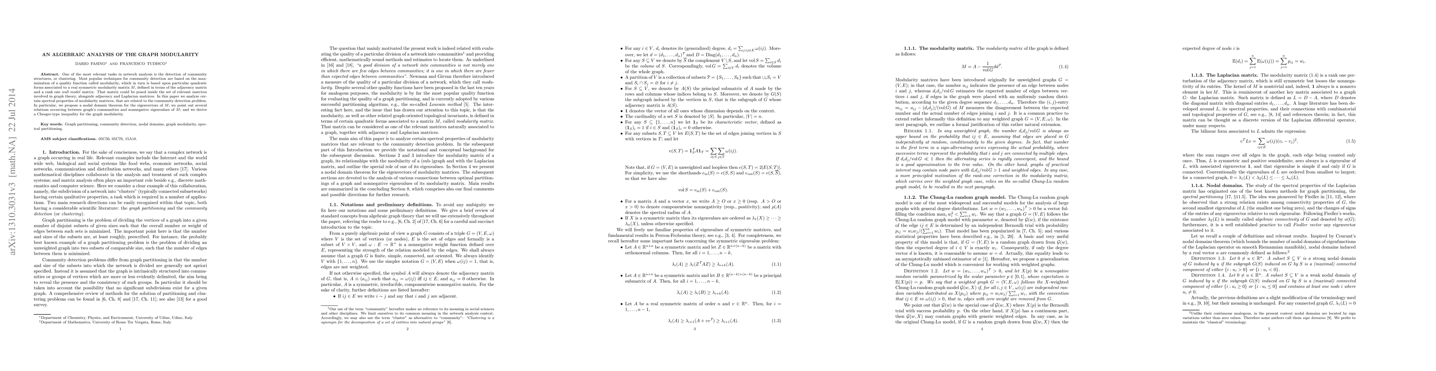 One of the most relevant tasks in network analysis is the detection of community structures, or clustering. Most popular techniques for community detection are based on the maximization of a quality function called modularity, which in turn is based upon particular quadratic forms associated to a real symmetric modularity matrix $M$, defined in terms of the adjacency matrix and a rank one null model matrix. That matrix could be posed inside the set of relevant matrices involved in graph theory, alongside adjacency, incidence and Laplacian matrices. This is the reason we propose a graph analysis based on the algebraic and spectral properties of such matrix. In particular, we propose a nodal domain theorem for the eigenvectors of $M$; we point out several relations occurring between graph's communities and nonnegative eigenvalues of $M$; and we derive a Cheeger-type inequality for the graph optimal modularity.