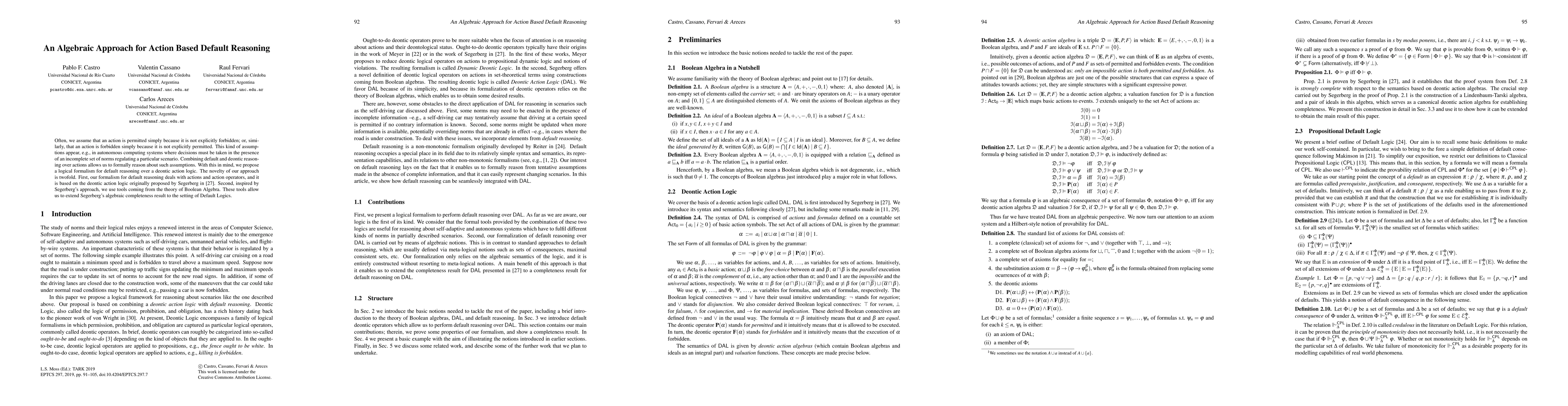 Often, we assume that an action is permitted simply because it is not explicitly forbidden; or, similarly, that an action is forbidden simply because it is not explicitly permitted. This kind of assumptions appear, e.g., in autonomous computing systems where decisions must be taken in the presence of an incomplete set of norms regulating a particular scenario. Combining default and deontic reasoning over actions allows us to formally reason about such assumptions. With this in mind, we propose a logical formalism for default reasoning over a deontic action logic. The novelty of our approach is twofold. First, our formalism for default reasoning deals with actions and action operators, and it is based on the deontic action logic originally proposed by Segerberg. Second, inspired by Segerberg's approach, we use tools coming from the theory of Boolean Algebra. These tools allow us to extend Segerberg's algebraic completeness result to the setting of Default Logics.