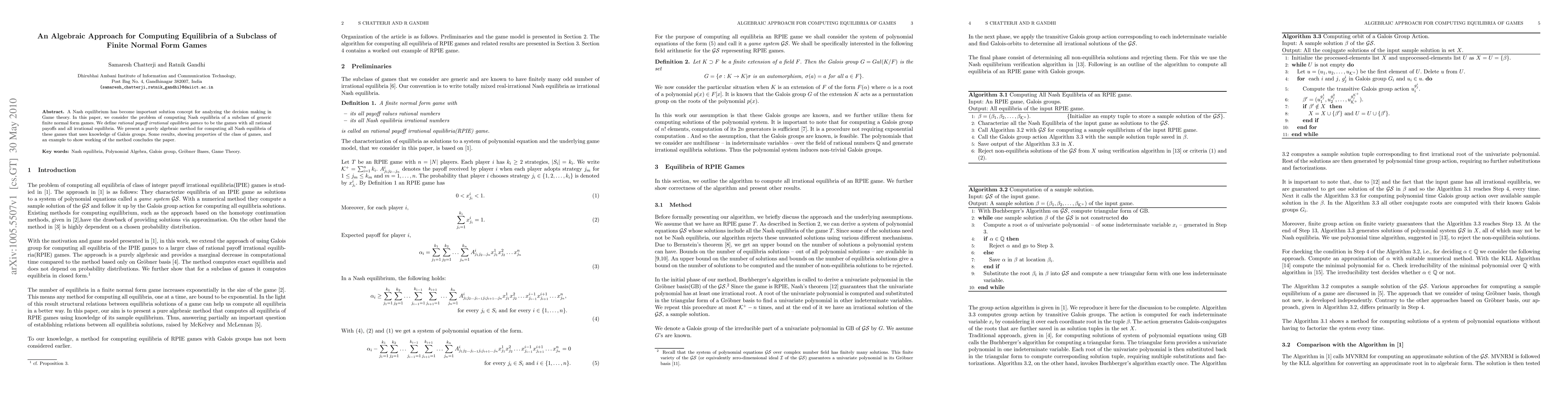This paper proposes an algebraic method for computing Nash equilibria in a subclass of finite normal form games characterized by rational payoffs and irrational equilibria. The method leverages Galois groups and provides an example to demonstrate its effectiveness.