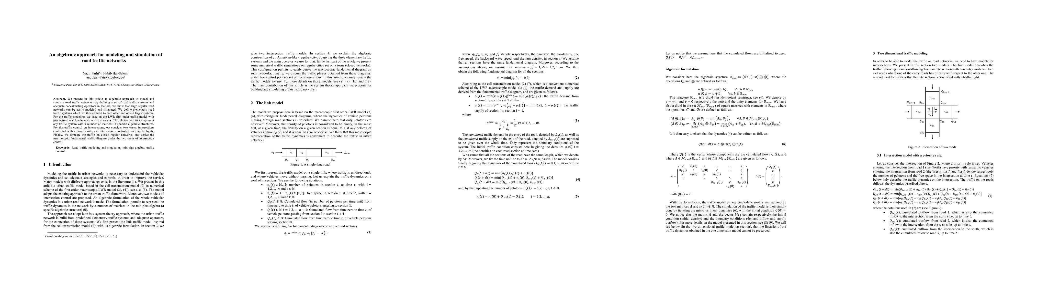 This paper introduces an algebraic framework for modeling and simulating road traffic networks using the Lighthill-Whitham-Richards (LWR) first-order traffic model. It employs elementary road traffic systems connected via concatenating operators to represent large regular networks, and simulates traffic control at intersections with priority rules and traffic lights.
